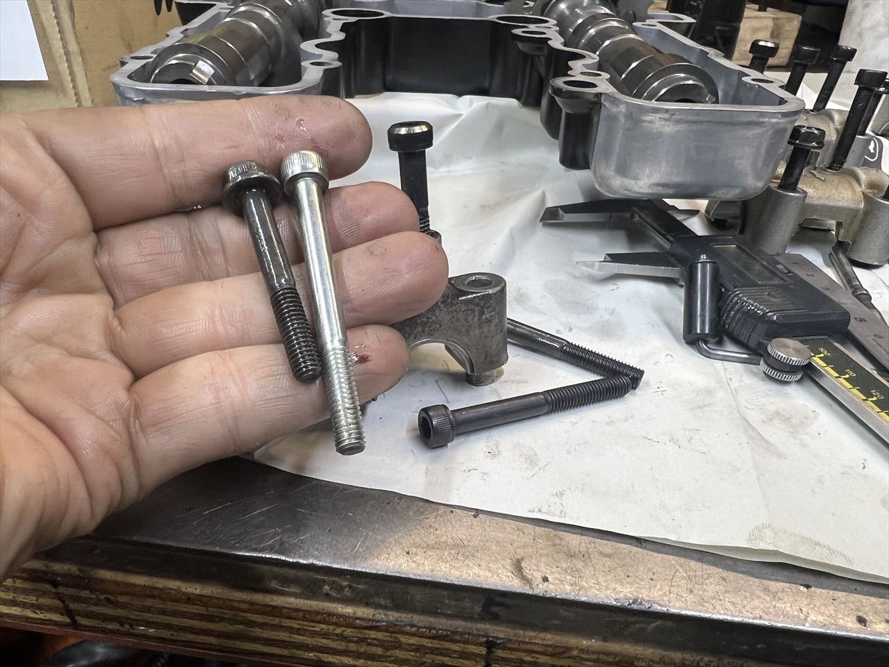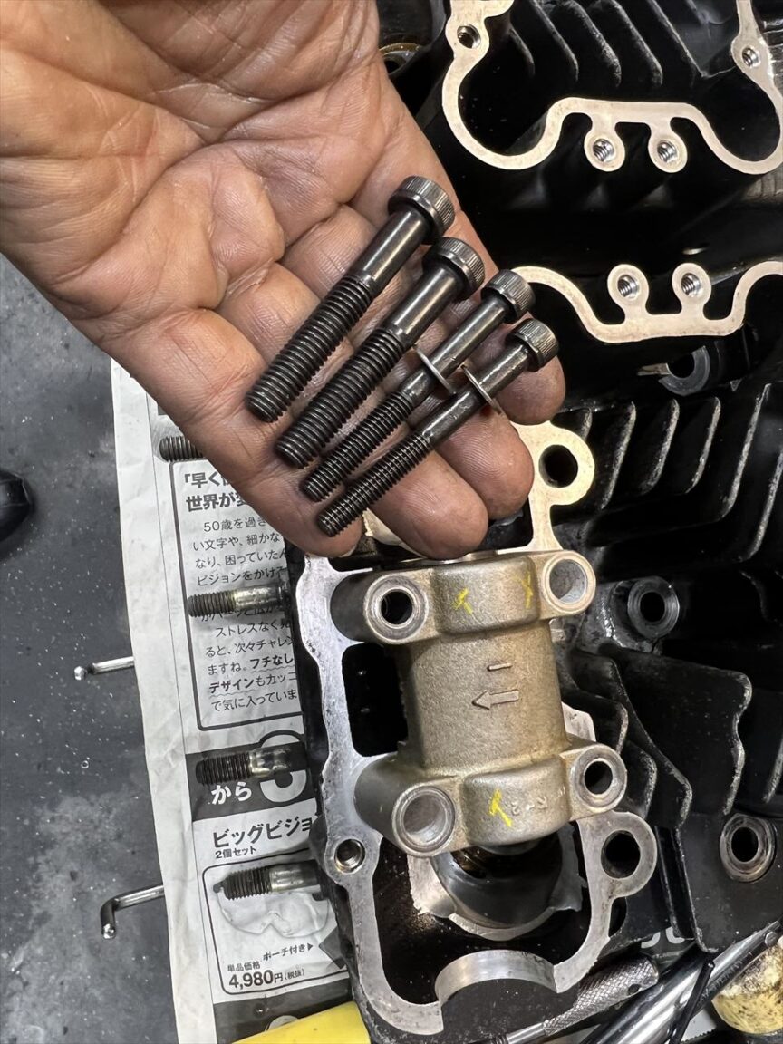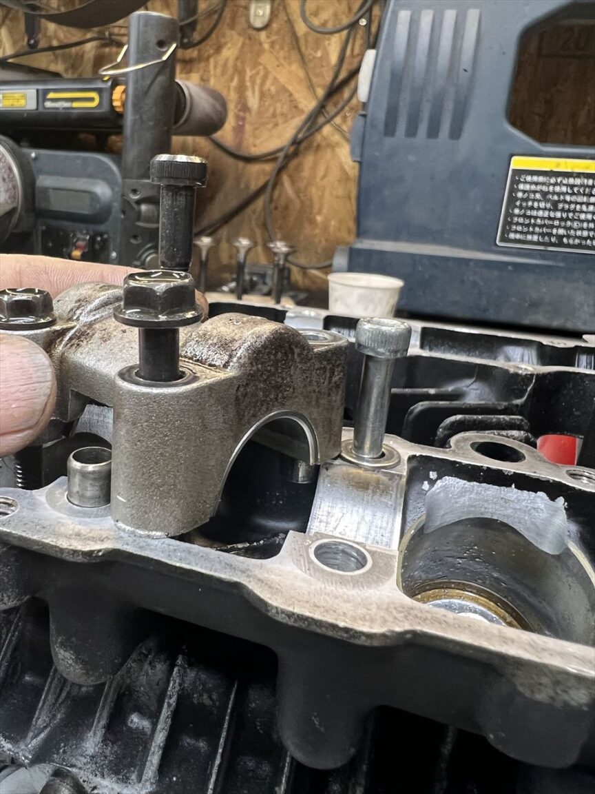 使用するロングボルトをねじ込んで、カムホルダーより低くなることを確認します。