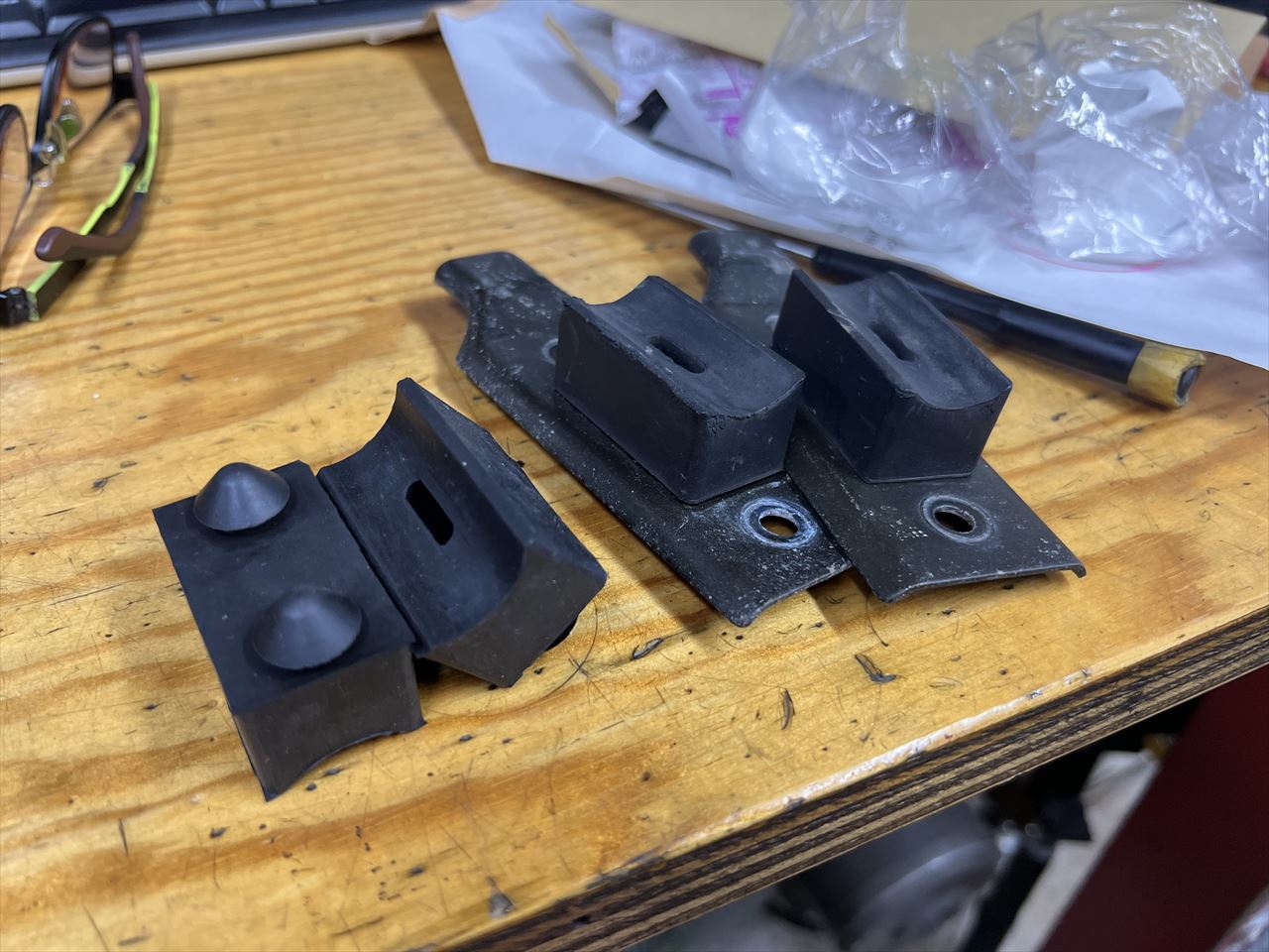 中間と後ろ側のラバーダンパー合計3個は生産廃止なので新品はありません。前側用のダンパーと差し込み形状は同じなので、削ってやれば取り付け可能です。紛失や極端に劣化している場合はその手法が有効です。