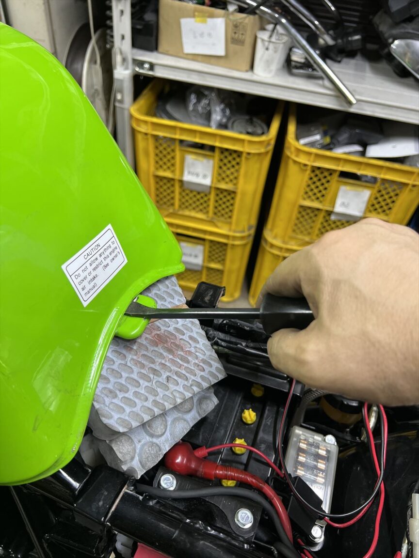 バッテリーは液面が下がって電極板が露出しているセルもありますね。液入りの従来タイプはこまめなバッテリー液の管理が必要です。今回はメンテナンスフリーバッテリーに交換予定です。