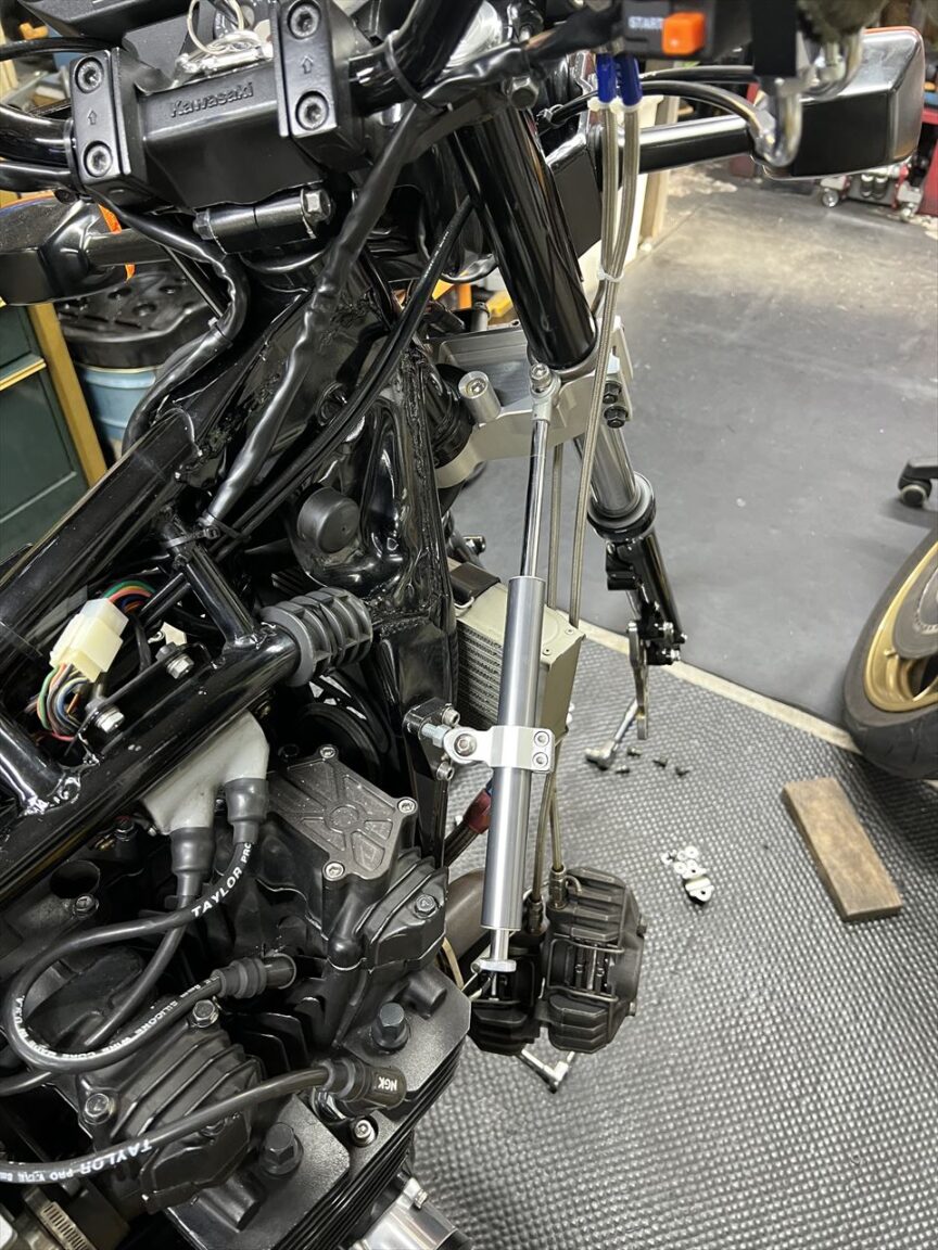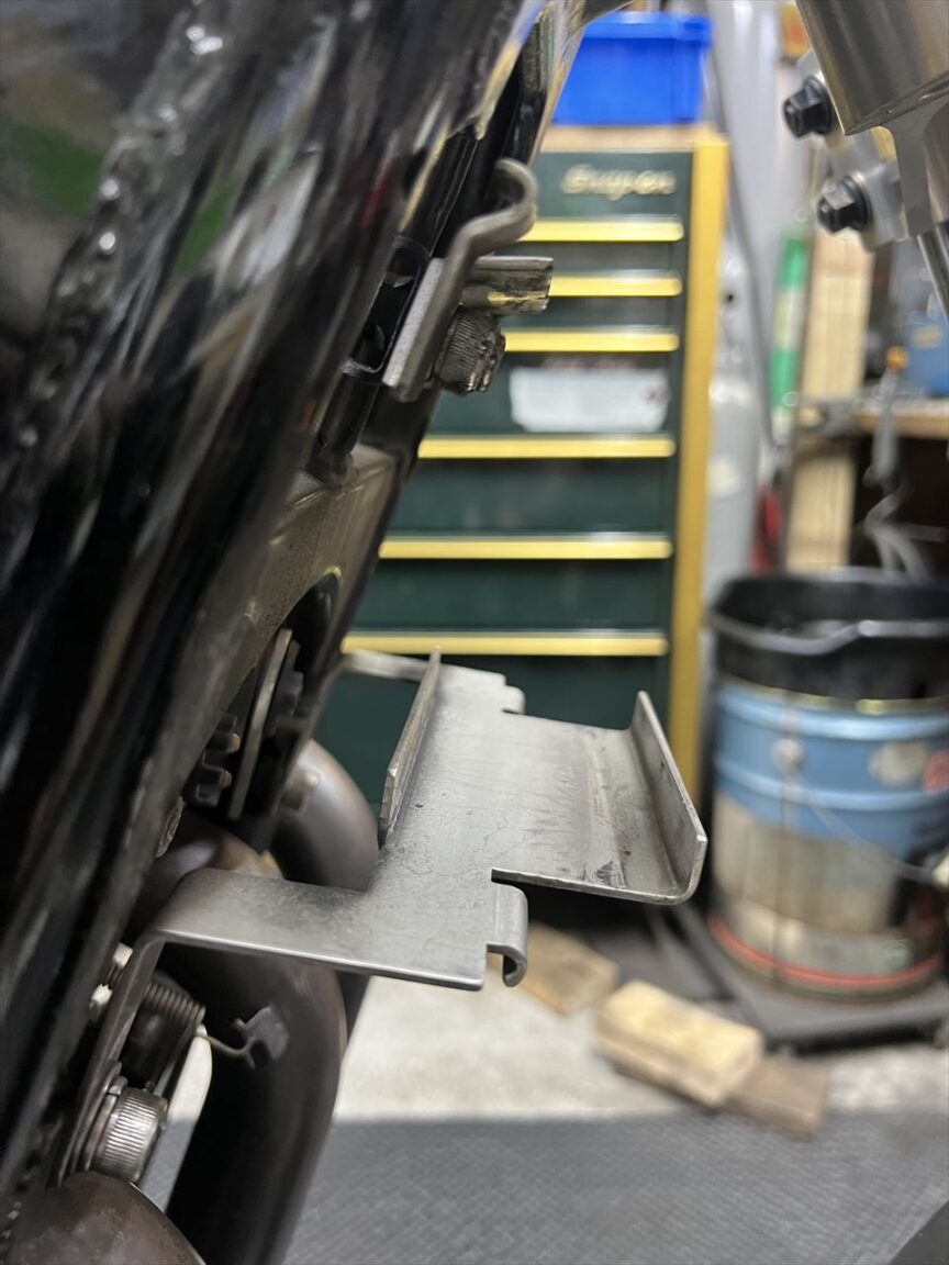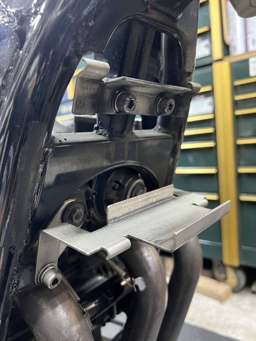 ステアリングダンパーはボルトオンのブラケットで取り付けられていますが、今回はS1同様の溶接ブラケットを取り付けます。ステダン自体はセルフステアを阻害し、低速ではハンドリングを悪化させるので付けない方がいいですが、今回はダミーとして取り付けます。