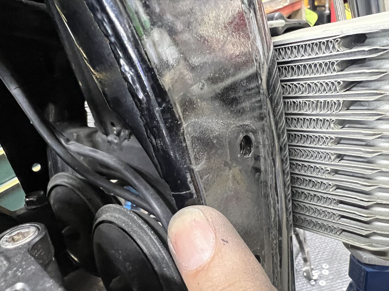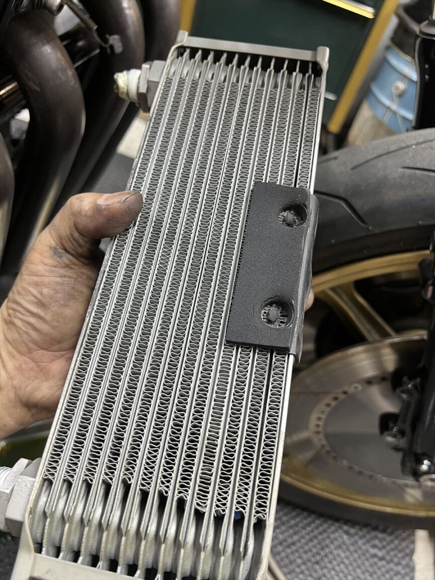 オイルクーラーコアの裏側はこんな感じにへこんでいました。