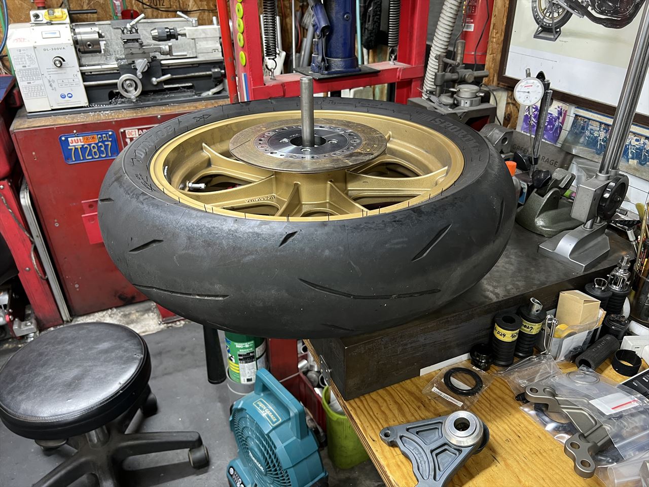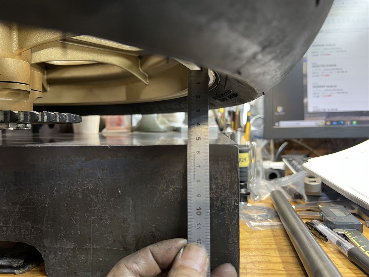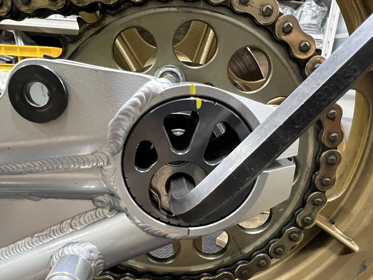 持ち上げている途中でどこかに当たって止まりました。ミッションのアウトプットシャフト→スイングアームピボット→リヤアクスルが一直線に並ぶところでチェーンが最も張りが少なくなりますが、それ以前の現状でもうチェーンはパンパンに張っています。完全に張り過ぎな状態ですね。このまま走行すると、3軸のベアリングに致命的なダメージを与えるので、チェーンの張り方はよく解った上で厳密に管理しないといけません。