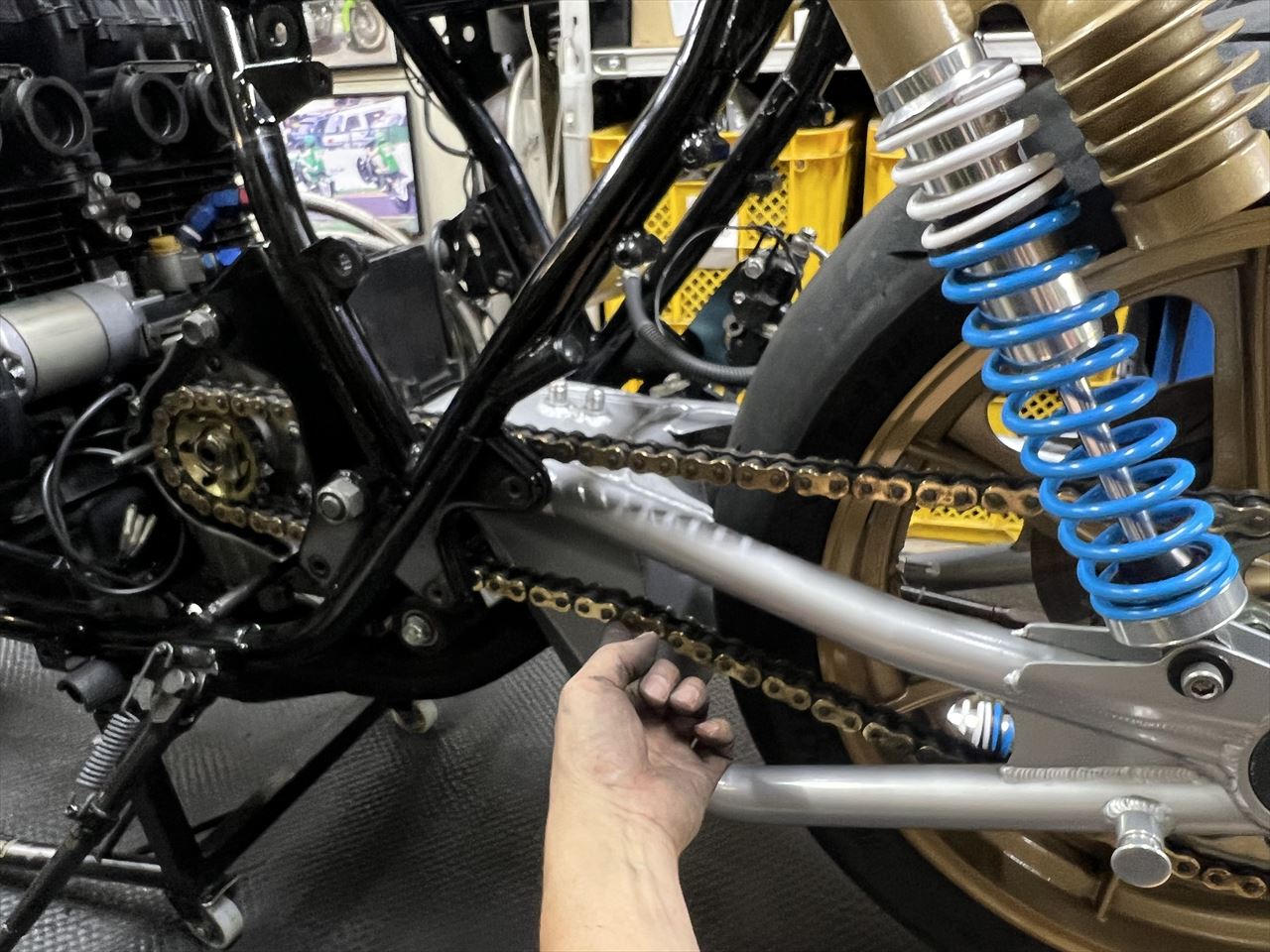 正しいチェーンの張りになるよう調整します。かなり緩めることになりました。