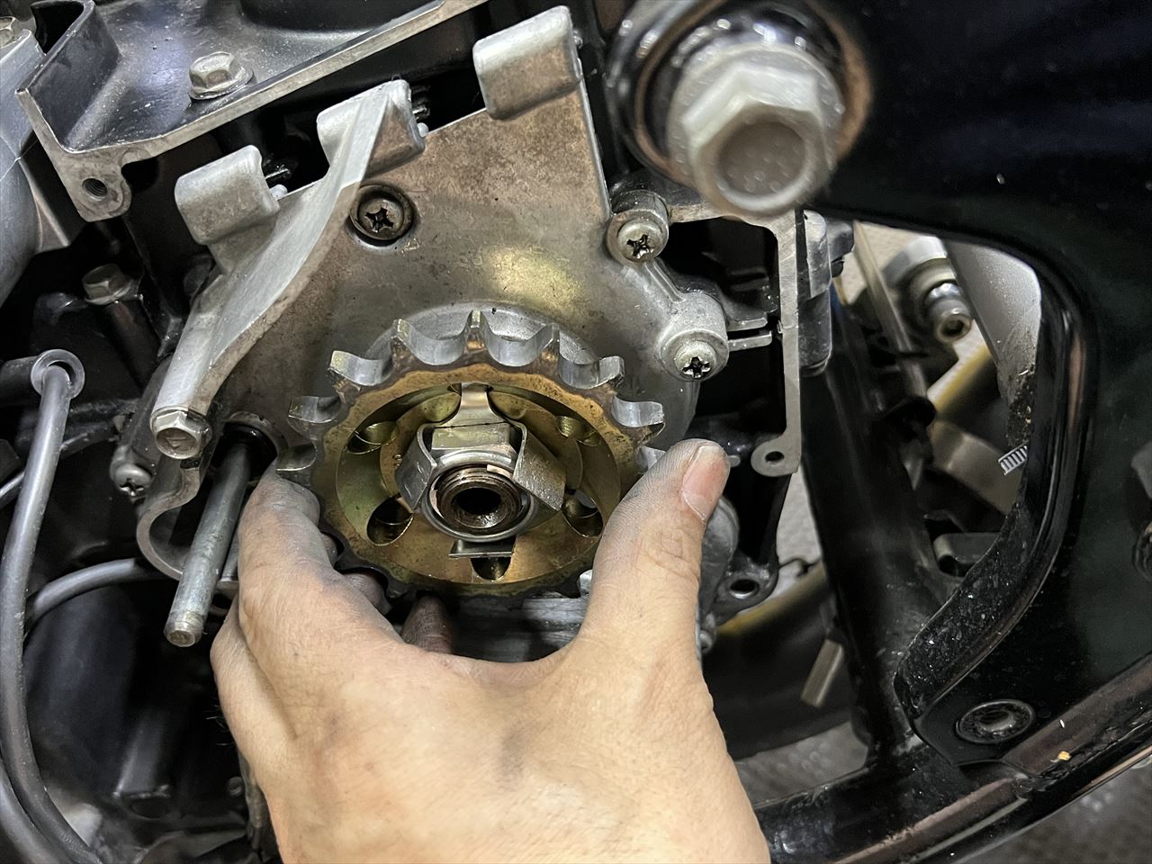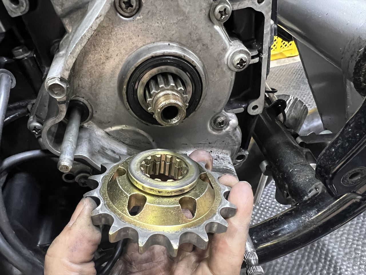 スプロケの裏側にはスペーサーが入っていました。本来はボルトを長い物に交換するべきですね。