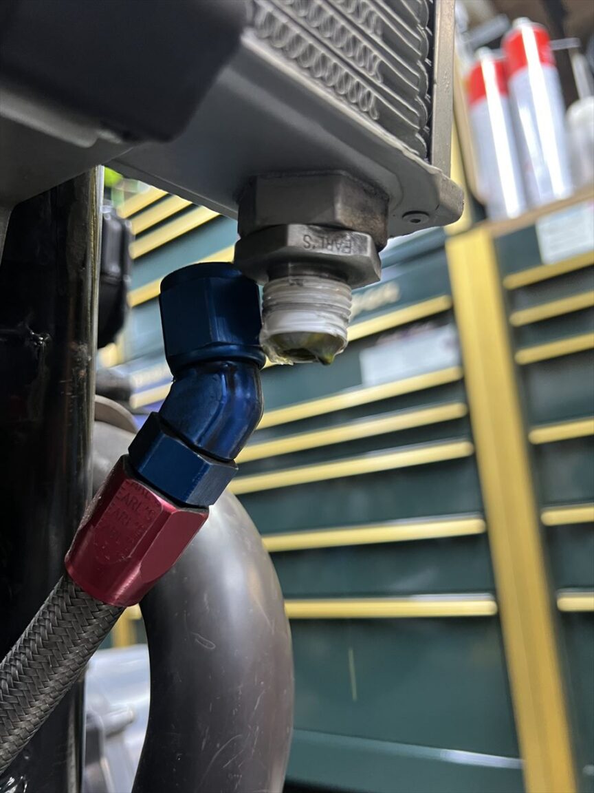 オイルクーラーホースを外すと、ネジ部とテーパー部分にかけてシールテープが巻かれています。これはレーシングパーツを理解していない人の仕事ですね。よく見かけますがANタイプのフィッティングにシールテープ使用は厳禁です。
