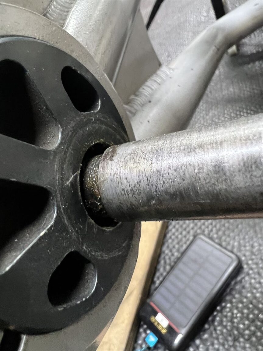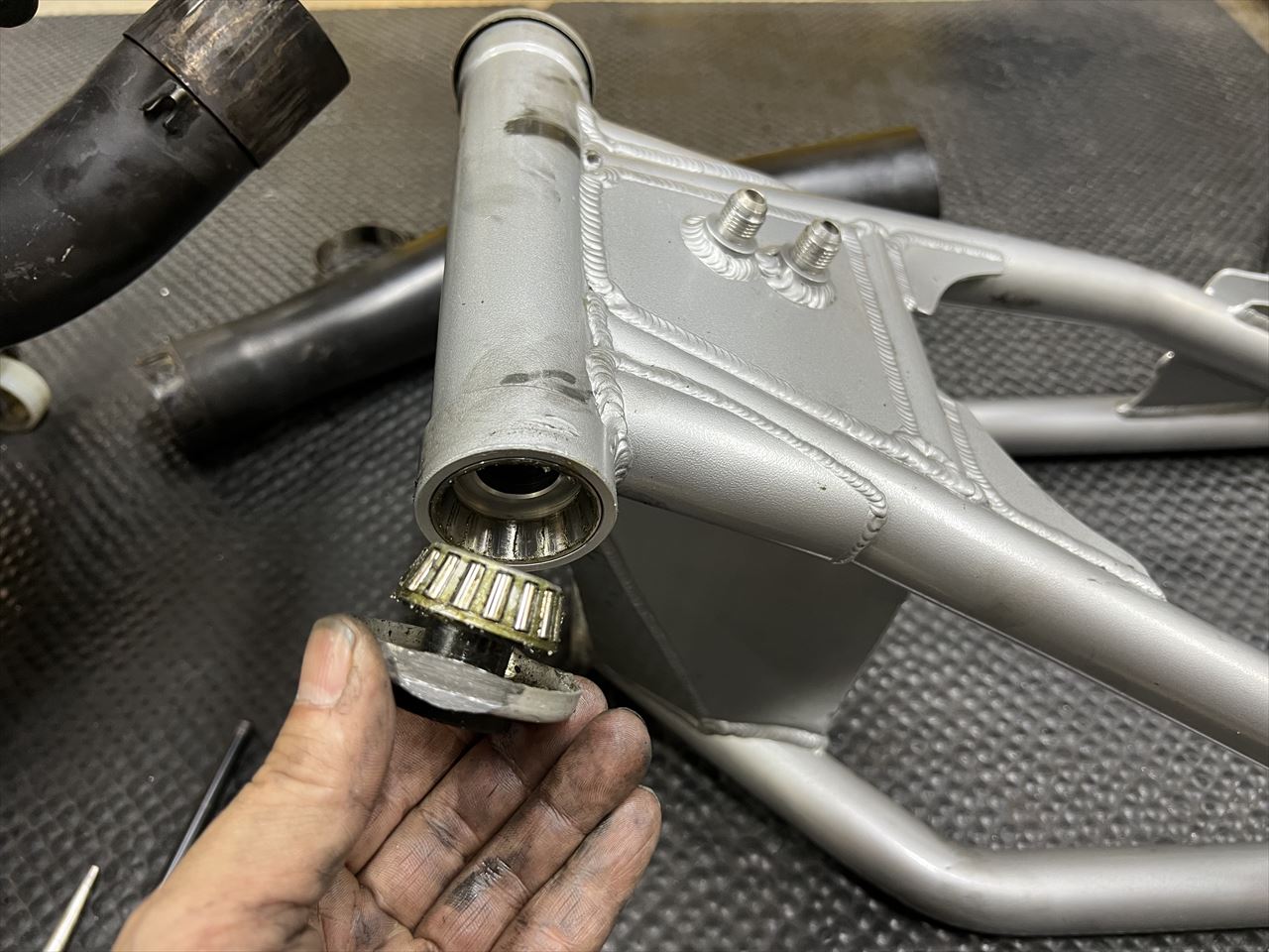 アウターレースには圧痕があります。基本的に貫通シャフトでディスタンスカラーが無い構造のピボットにテーパーローラーベアリングを組み合わせた構造のスイングアームは、プリロードとピボットシャフト締め付けトルクの確保が両立しません。締め付けトルクはフレームの剛性に依存し、規定トルクの8kg・mを掛けようとするとフレームがすぼんでプリロード過多となります。プリロードを適正にすると締め付けトルクが圧倒的に足りず、ピボットは走行中にガタつくことになります。よって、スイングアームとして成り立たない構造といえます。このようなテーパーローラーベアリングをピボットに持つスイングアームは、ベアリングハウジングが広がって破損していることも多くみられ、使用しない方がいいでしょう。結局スイングアームは交換することになりました。
