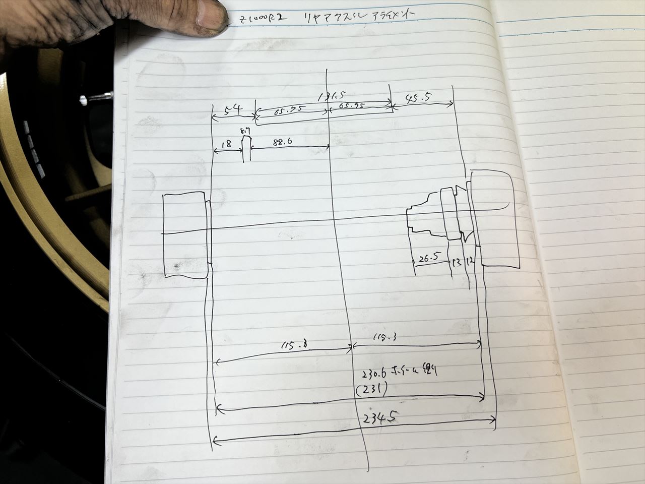 計測結果はこちら。現状は4.25ミリホイールが右にズレていました。チェーンラインはノーマルだったので、フロントスプロケットのオフセットとも合いません。