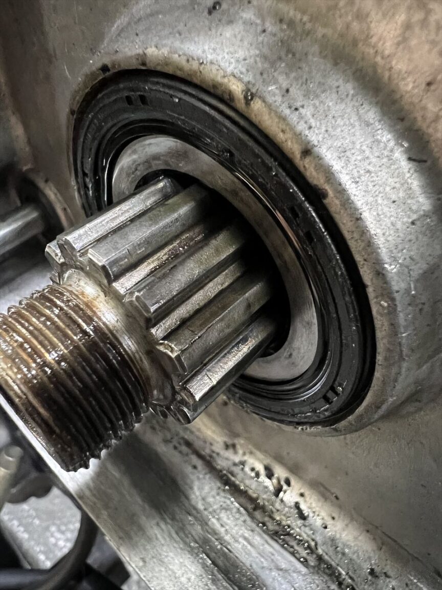 オイルシールの圧入も浅く、スプロケ背面がオイルシールに擦っていました。J系の場合はミッションケース裏側とオイルシールが面一になるよう圧入する必要があります。そうすると表側は2ミリほどオイルシールが沈んだ状態になるのが正解です。これでは明らかに圧入不足です。