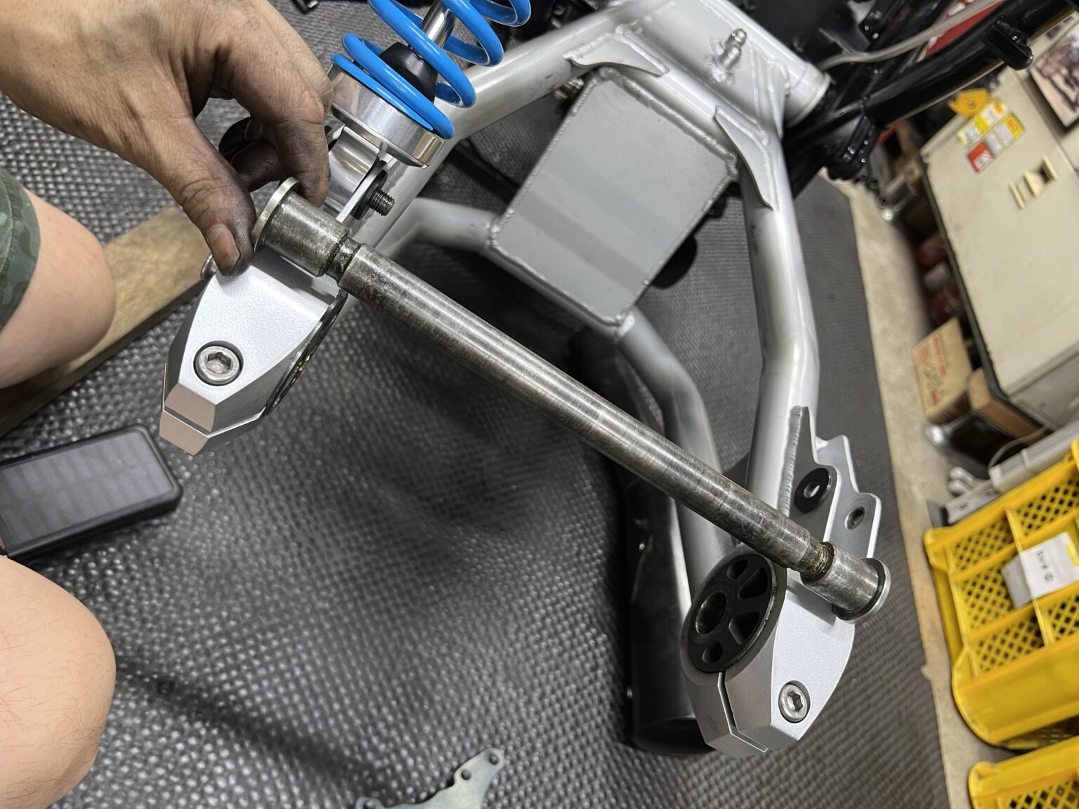 スイングアームが当たっていたのはリヤマスターでした。この状態で走行していないとのこと。走っていたら確実に破損していました。