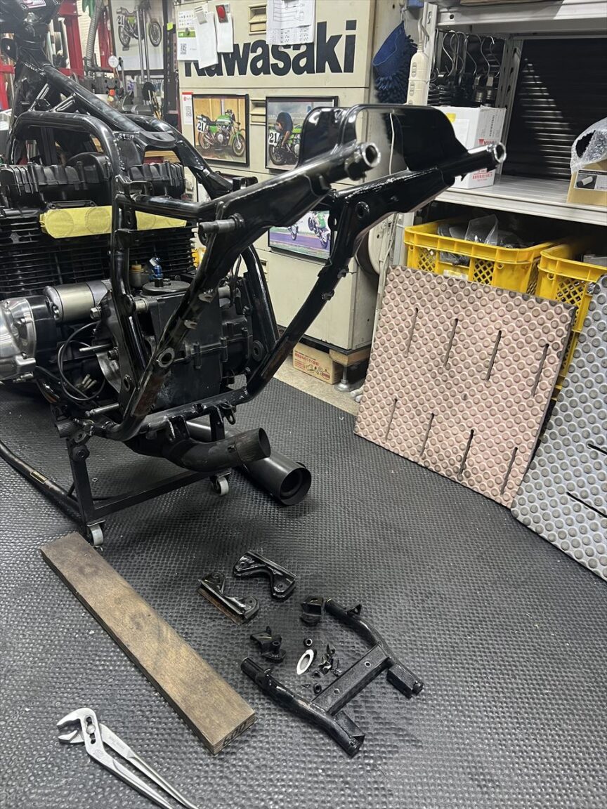 不要なブラケット類は削除しますが、チェーンガイドローラーの付いているセンスタブラケットは残しておきます。