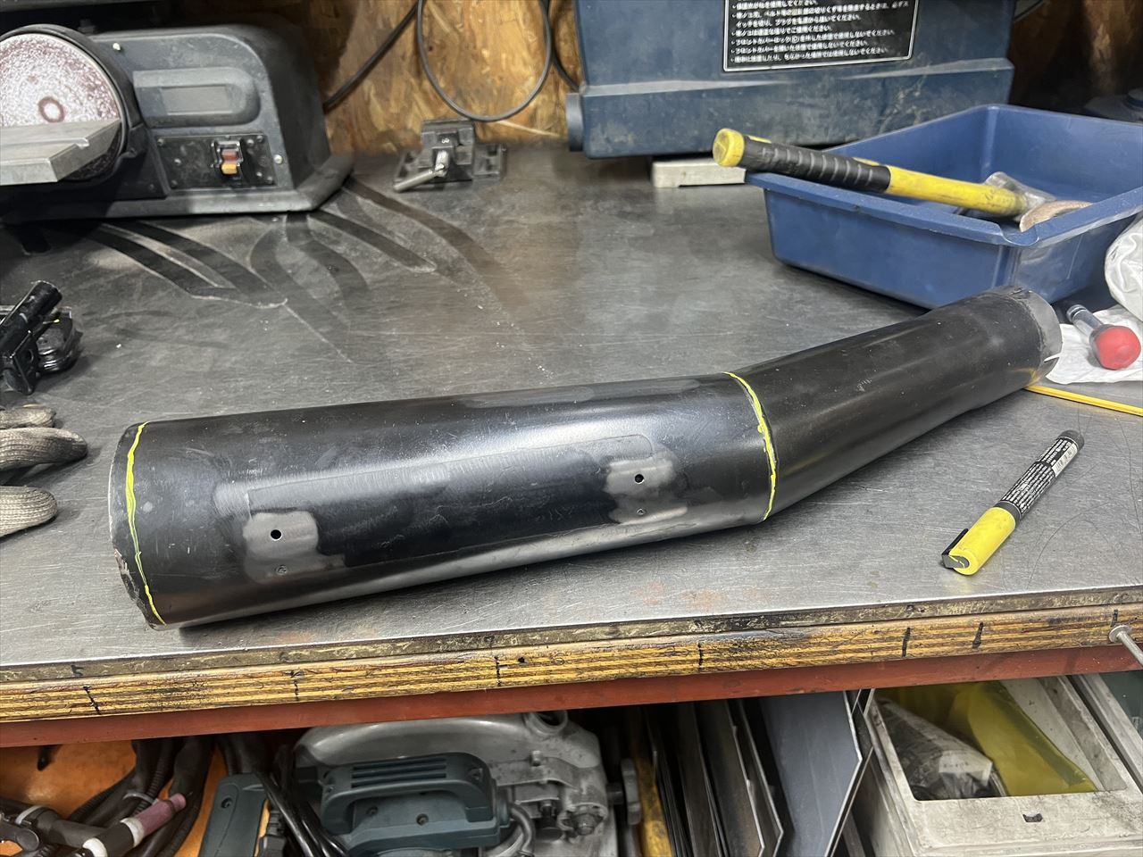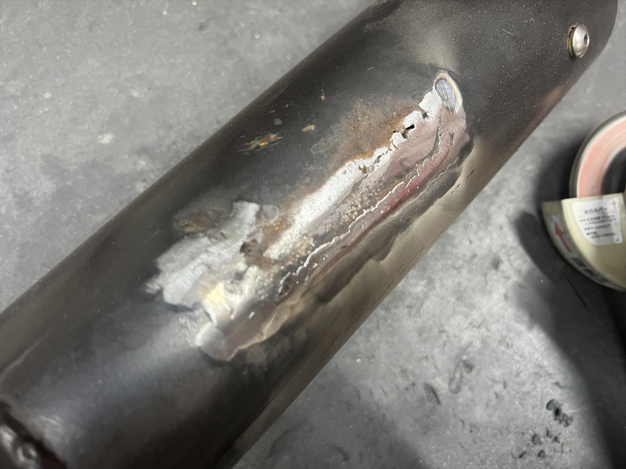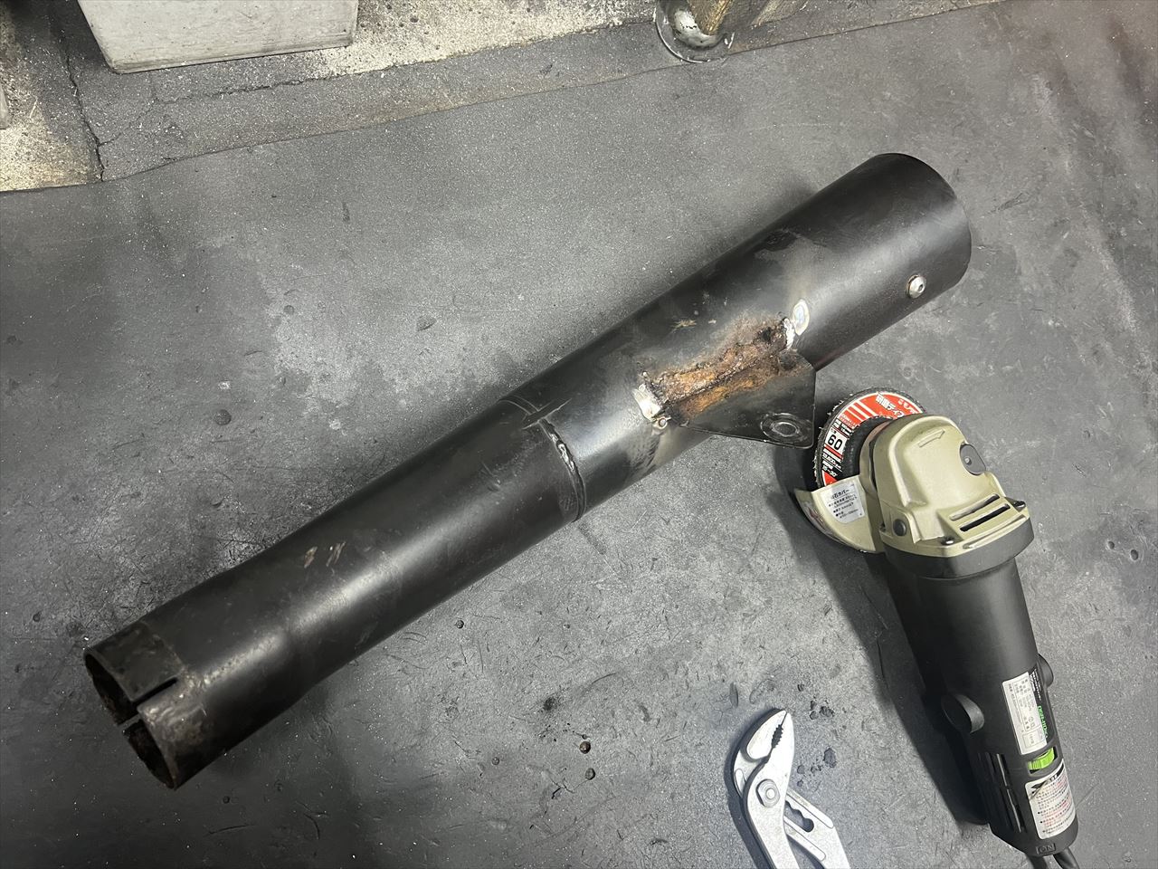 バッフルを外そうとしますが、錆びて固着して外れません。一旦切断してからでないと外れないかもしれないので、傷んだこのサイレンサーは使用せずマフラー交換することに。