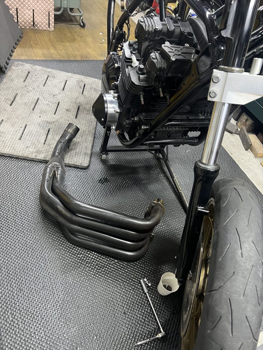 エキパイを差し込みます。オイル交換の際は、このようにエキパイを左右に振り分ければできるので便利です。
