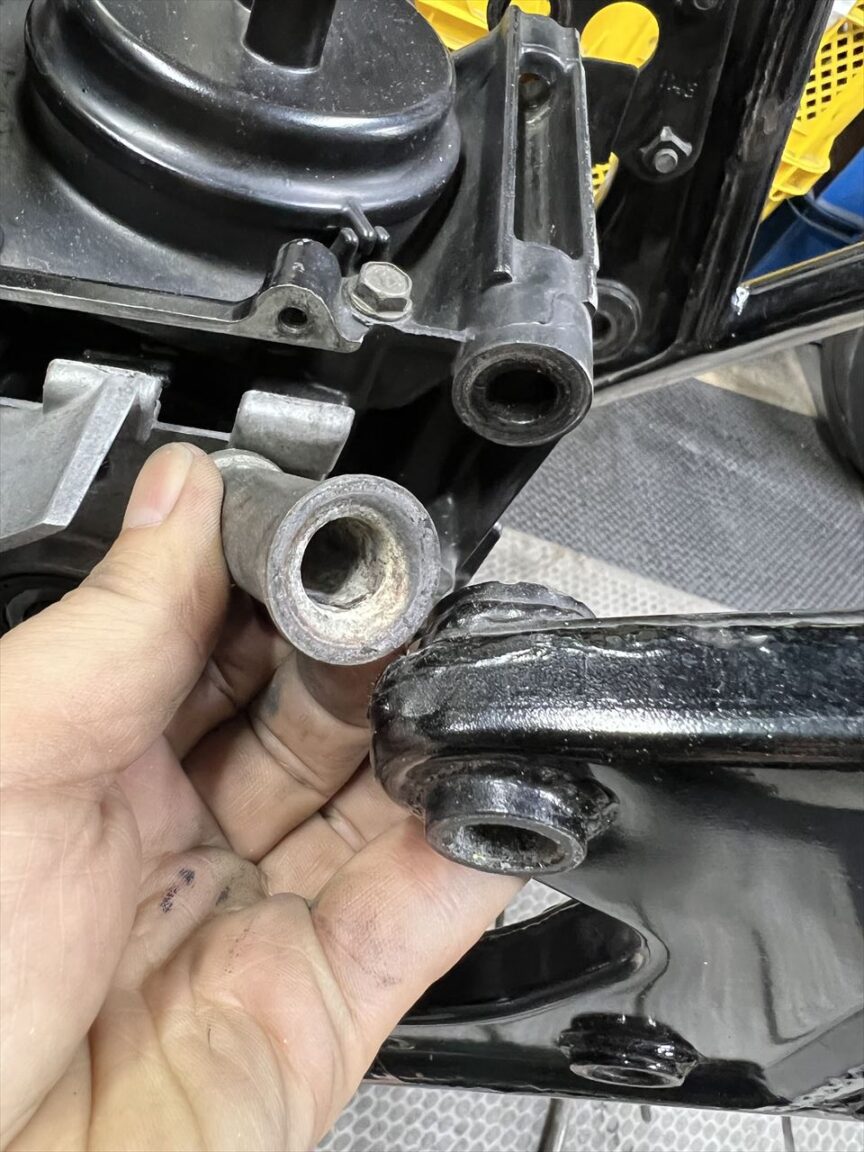 エンジンをジャッキアップし、既存のノーマルエンジンマウントを外します。ノーマルのカラーはクランクケースに接する面が狭いので、柔らかいアルミのケース側が削れてしまうのが難点。