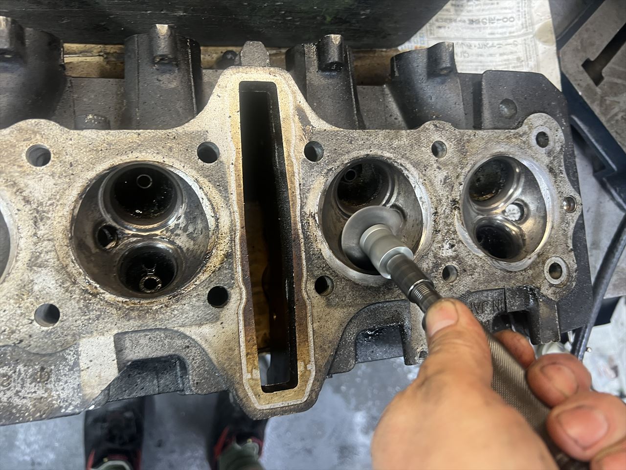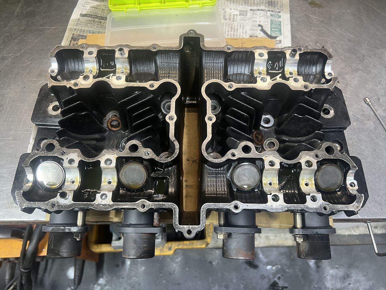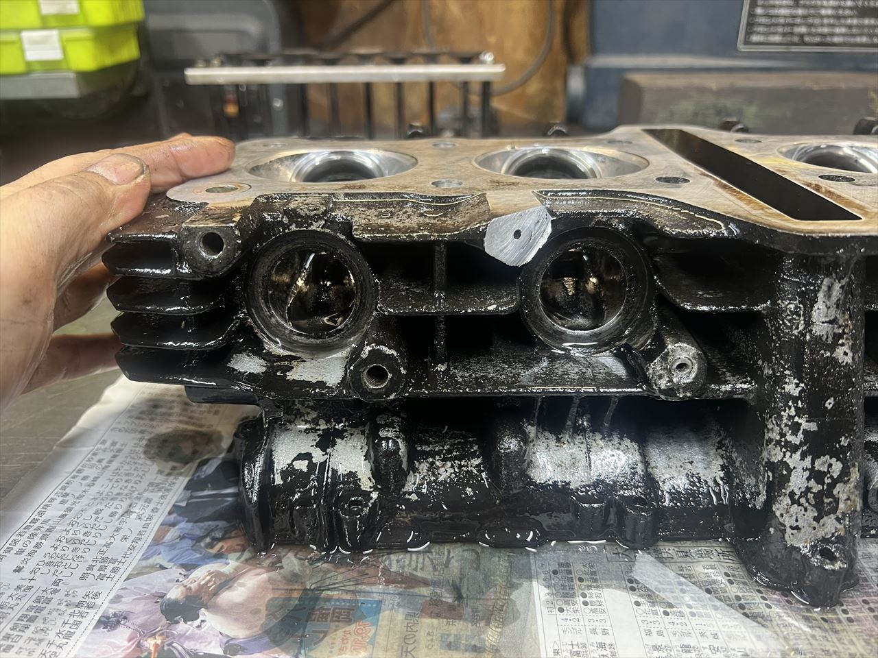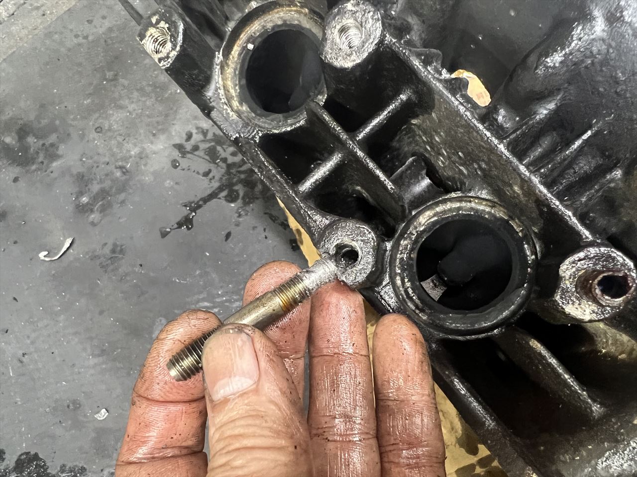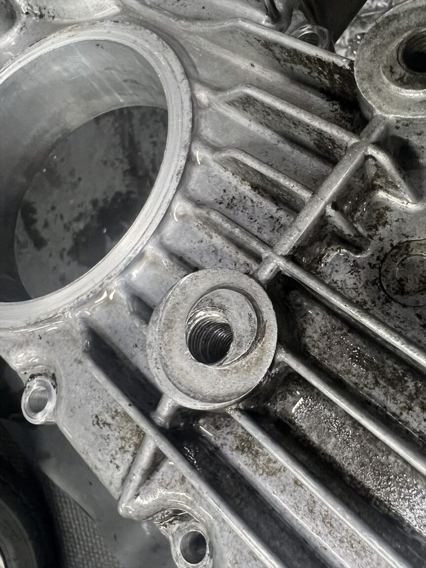 サビて折れ残っているところもあり、スタッドは折れ残ったものを修理してステンレススタッドに交換してあったようですが、その修理はややお粗末な状態。角度が違って入っているスタッドは、ヘッド側の雌ネジ部分を切開して大修理が必要です。