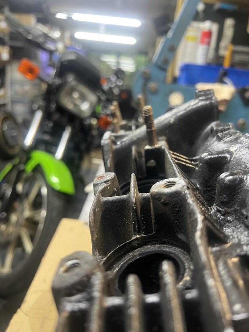 エンジンは塗装するので、点検しながら洗浄して準備します。シリンダーベースのガスケットはかなり固着しているのと、スタッドはだいぶ錆もあるので、スタッドを抜いてガスケットを剥がします。