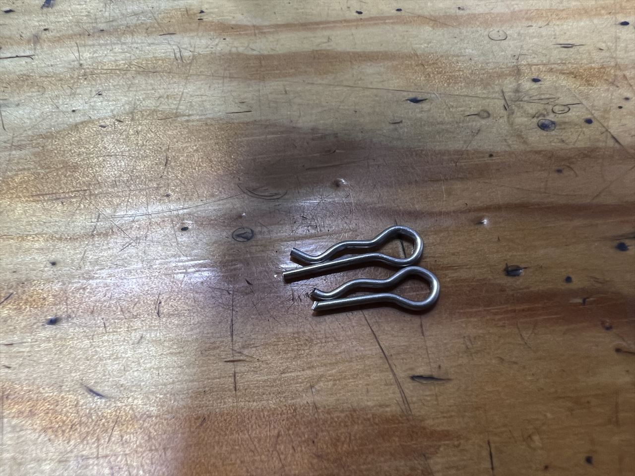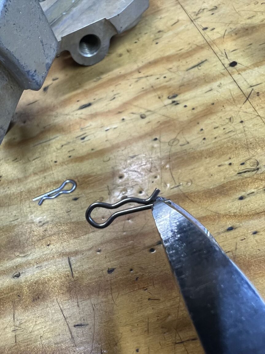カットしたピンはこんな感じで入ります。このベータピンの挿入は、車載状態では非常に難しい作業です。確実に固定しないとパッドの脱落事故に繋がるので、取り付け前に十分練習してください。