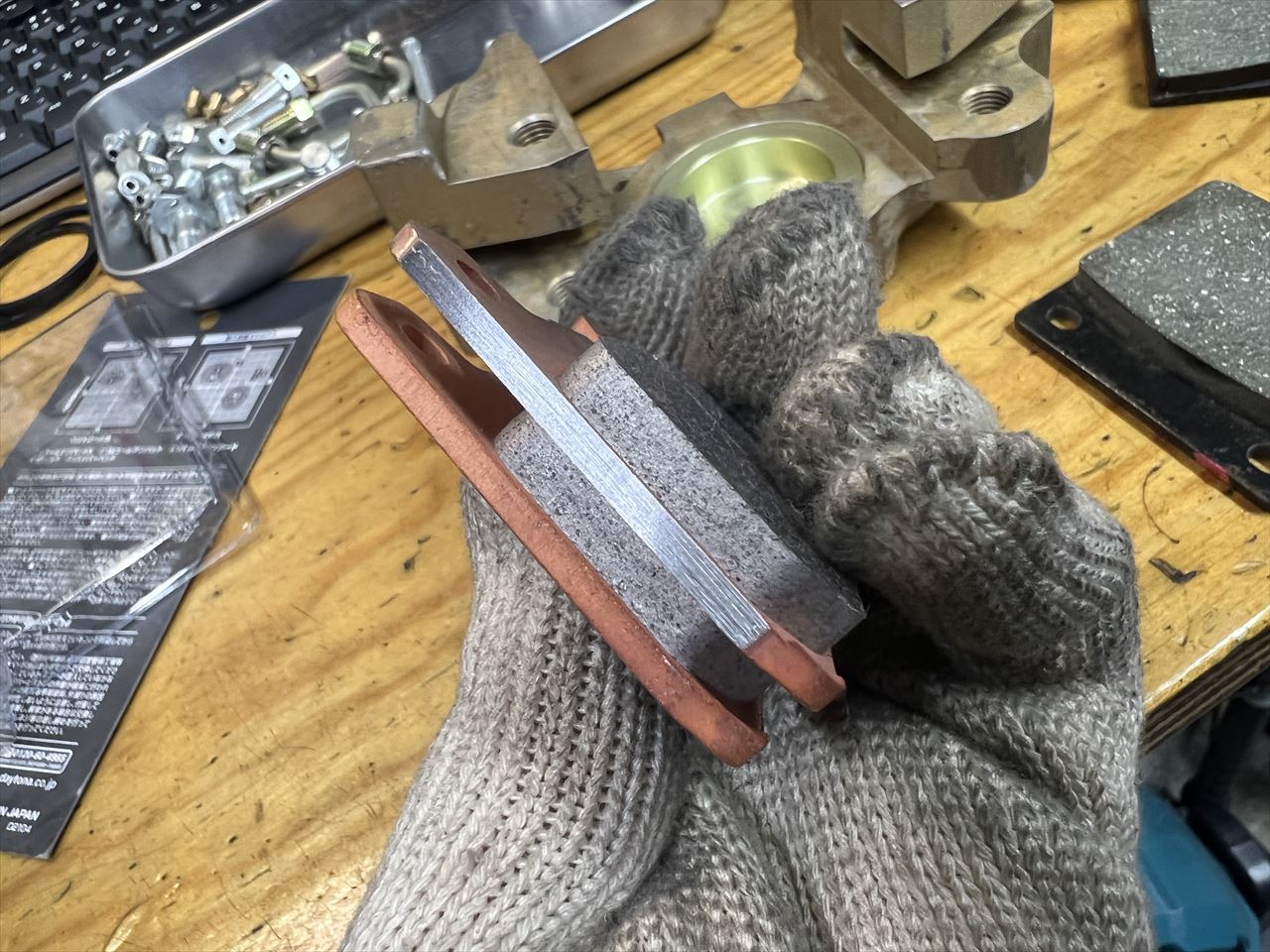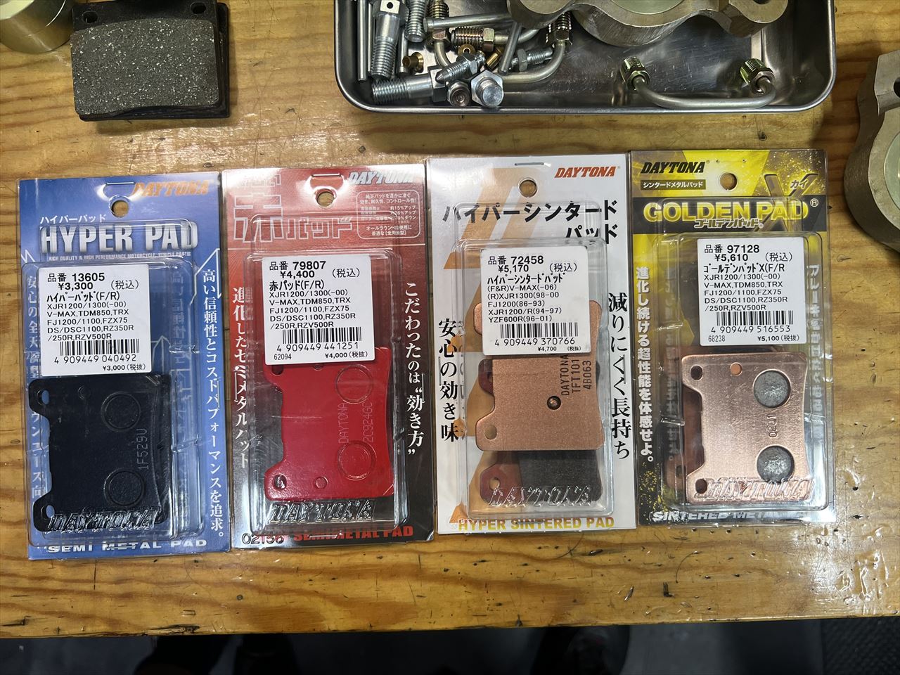 パッドはV-MAX用がとりあえず使えます。デイトナだけでも4種類あるので、用途に合わせて選べますね。セットにしているのは一番レース寄りなゴールデンパッドχ(カイ)です。ステンレスローター専用です。