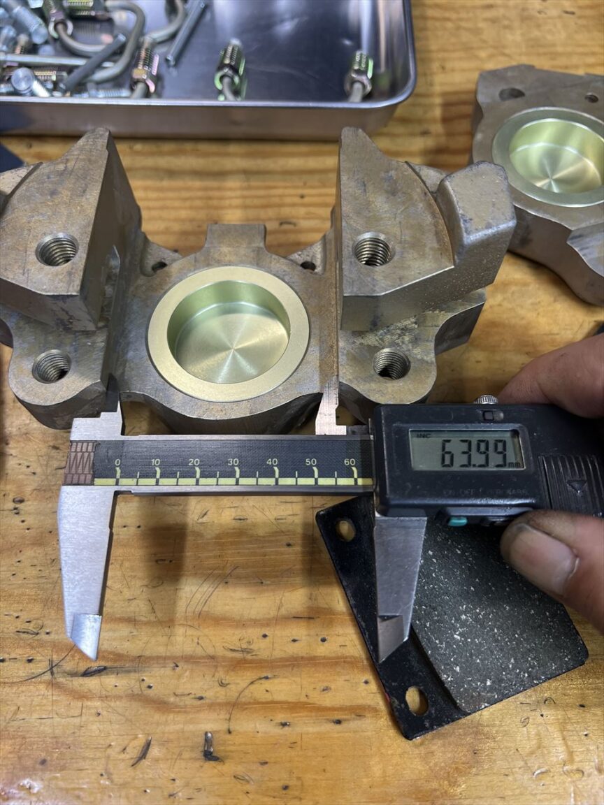 ピストン径も本物と同じ大口径です。ビッグボアでショートストロークなので、ピストンが出てきた時のピストンの倒れが生じやすい構造です。パッドは1ミリ摩耗したら交換をお勧めします。