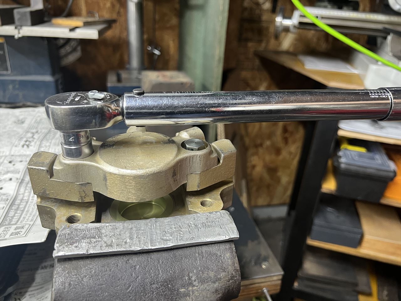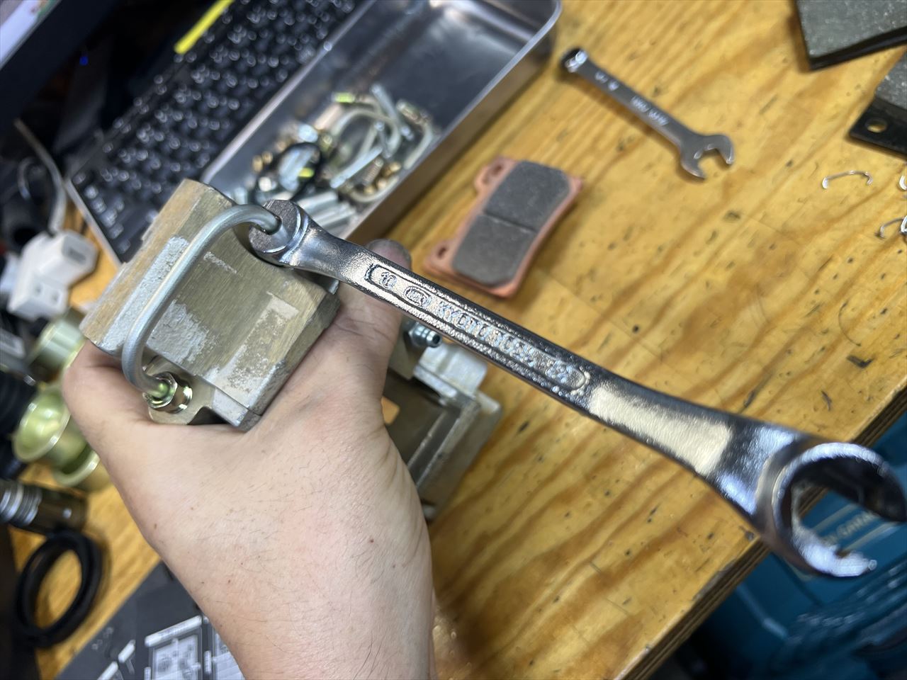 ブレーキチューブのフレアナット周辺は狭いので、フレアナットレンチは外径を削って小さくしたもので締め付けます。