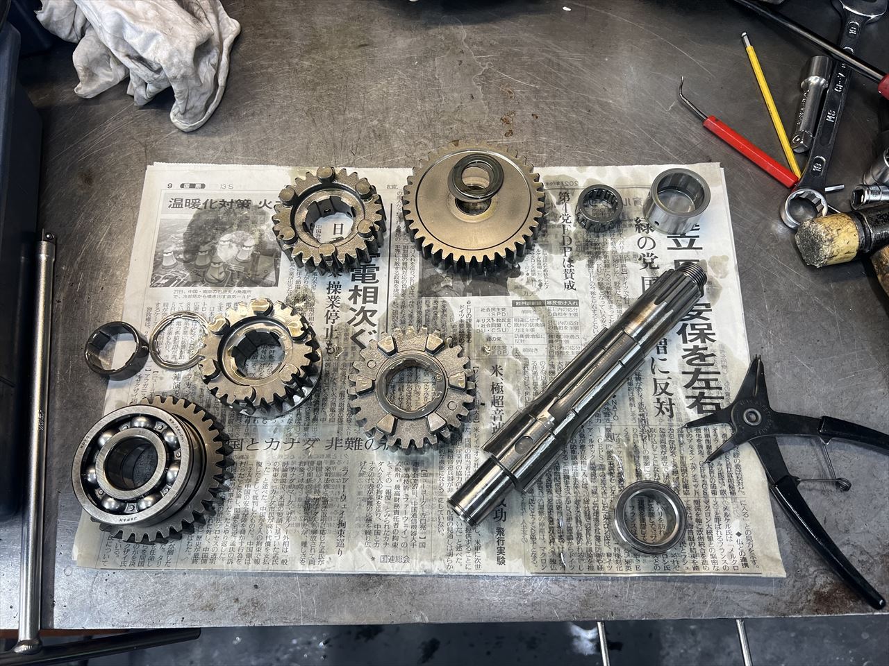 エンジンは全分解し、くまなく洗浄します。ギヤ類に特に大きなダメージは無いようです。