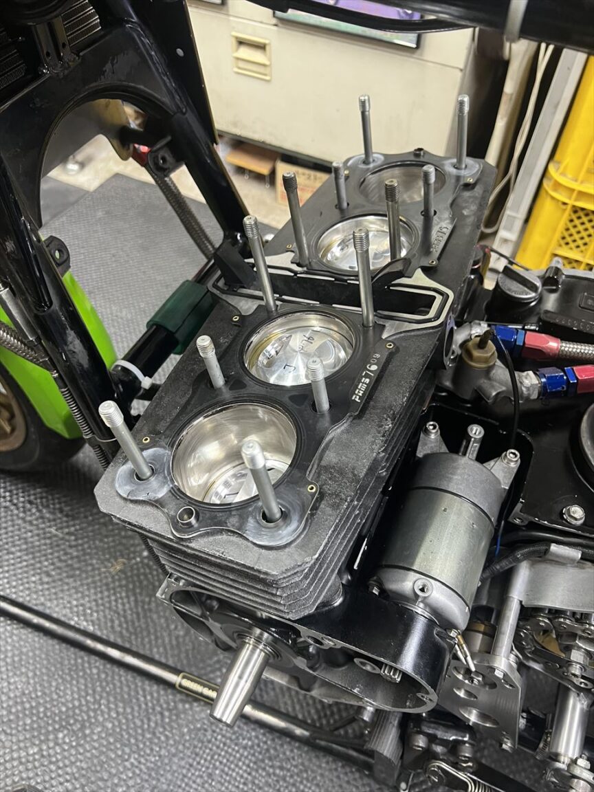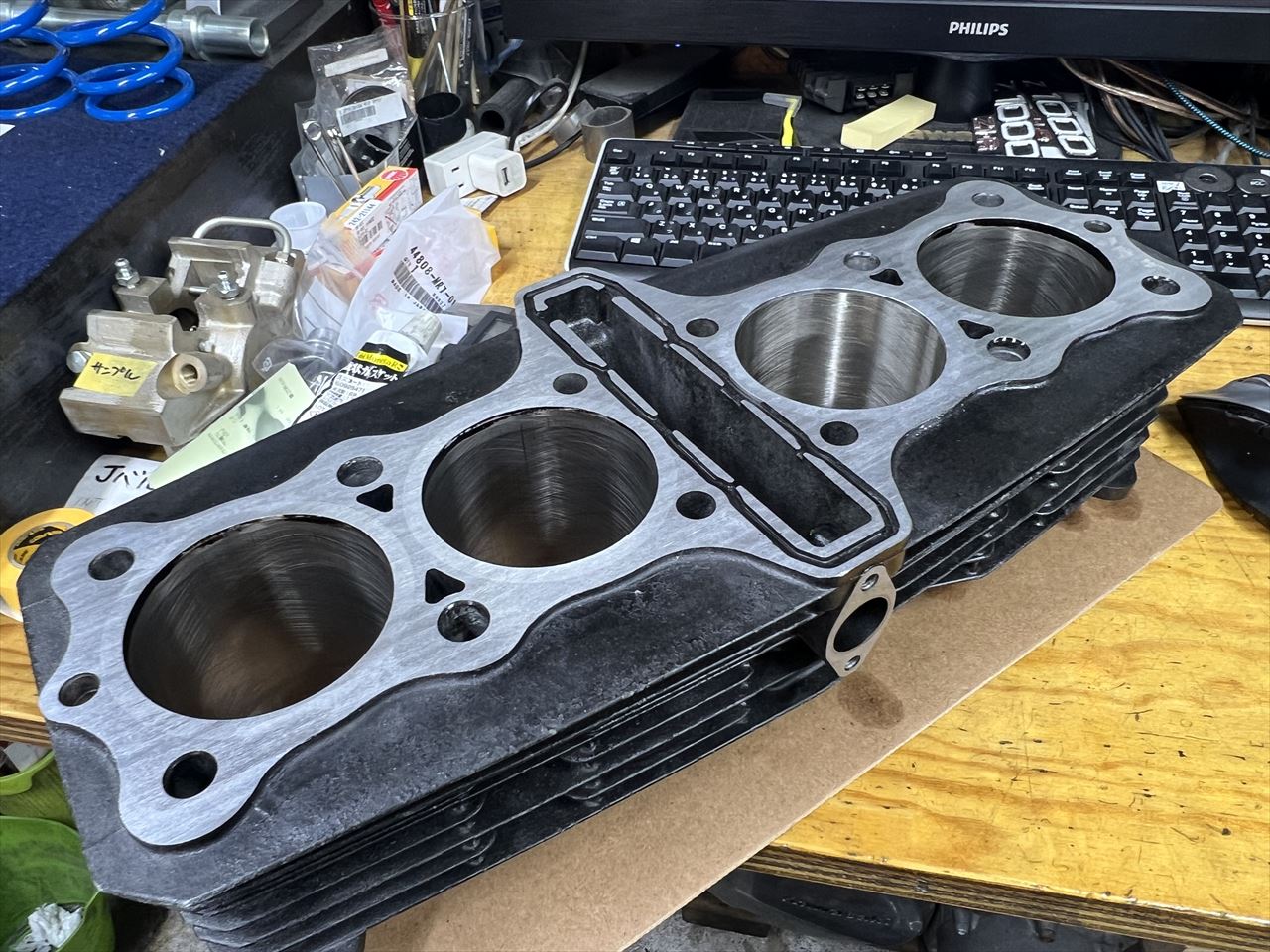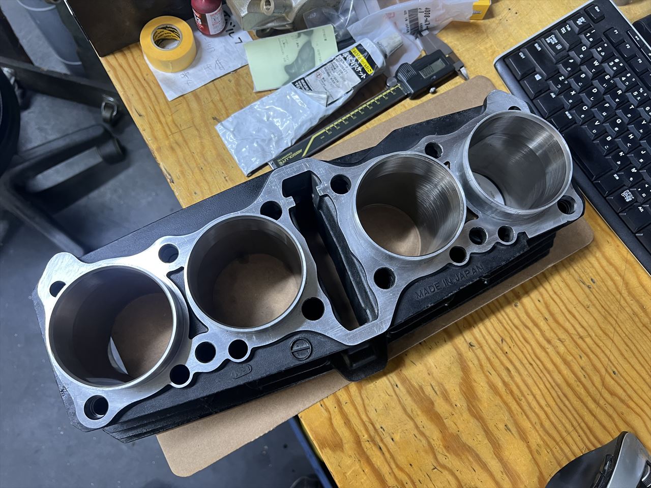 こちらは修理後のシリンダーです。1年前にイノウエボーリングのアルミシリンダー「ICBM」でφ76ミリにしていたのですが、他の3気筒はいたって状態がいいので、ブローした3番シリンダーのみ同じアルミスリーブで交換しました。シリンダー上下面は再面研しています。