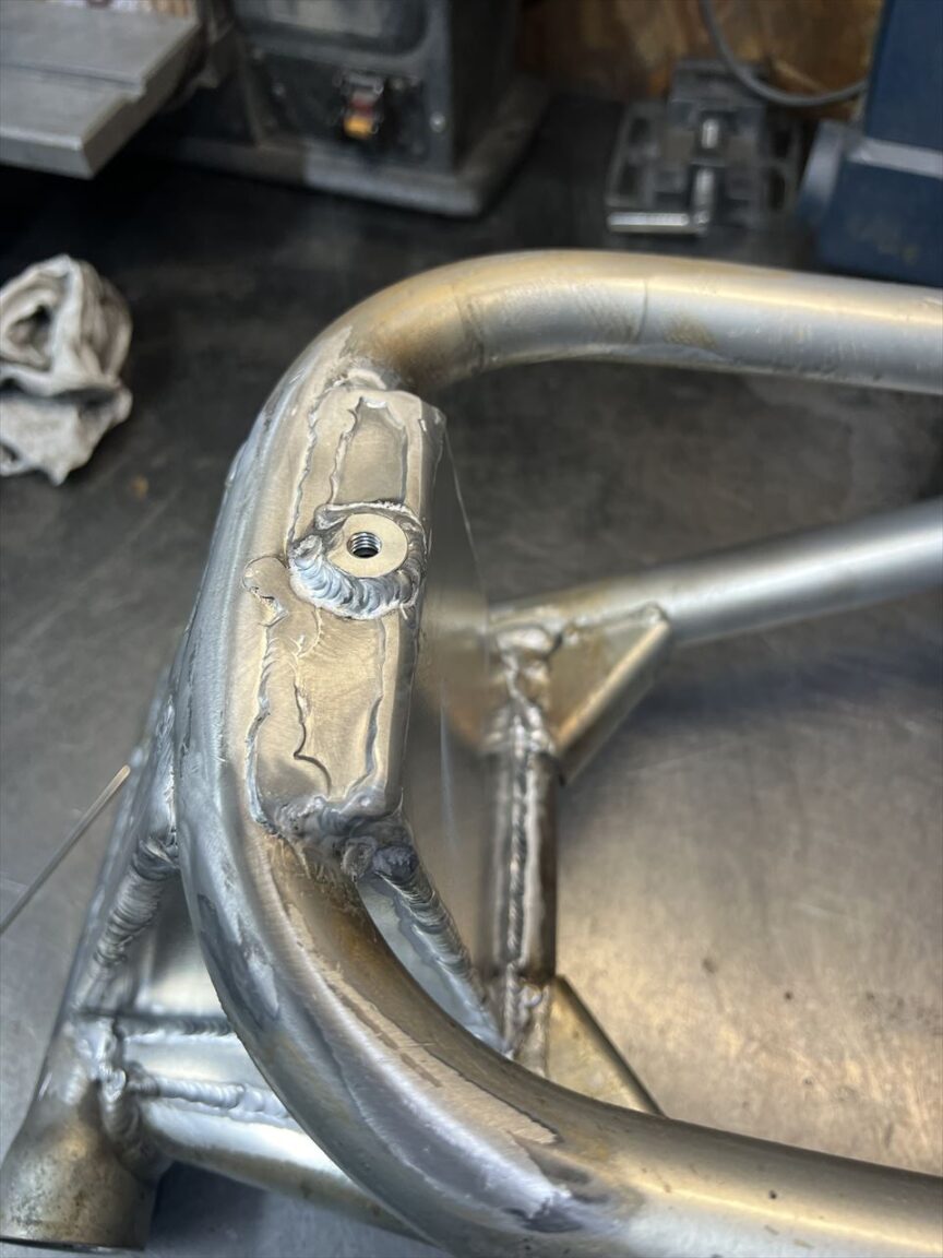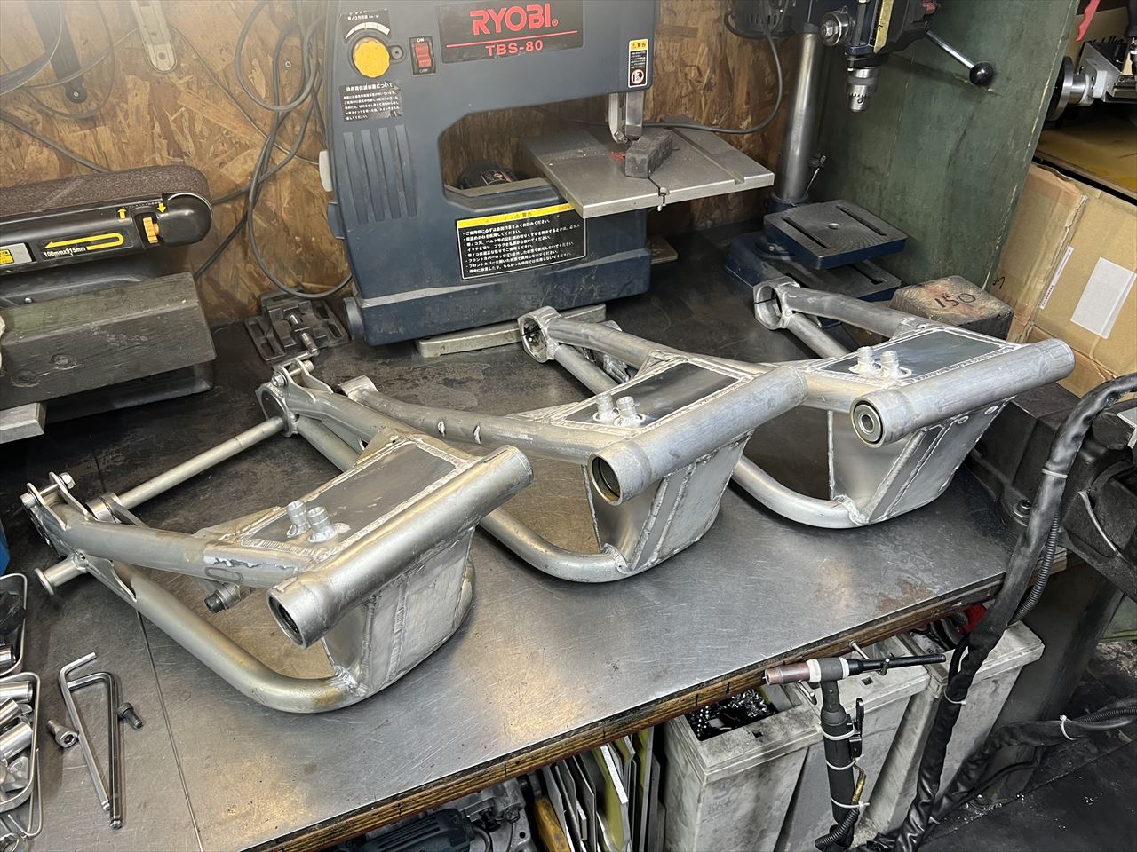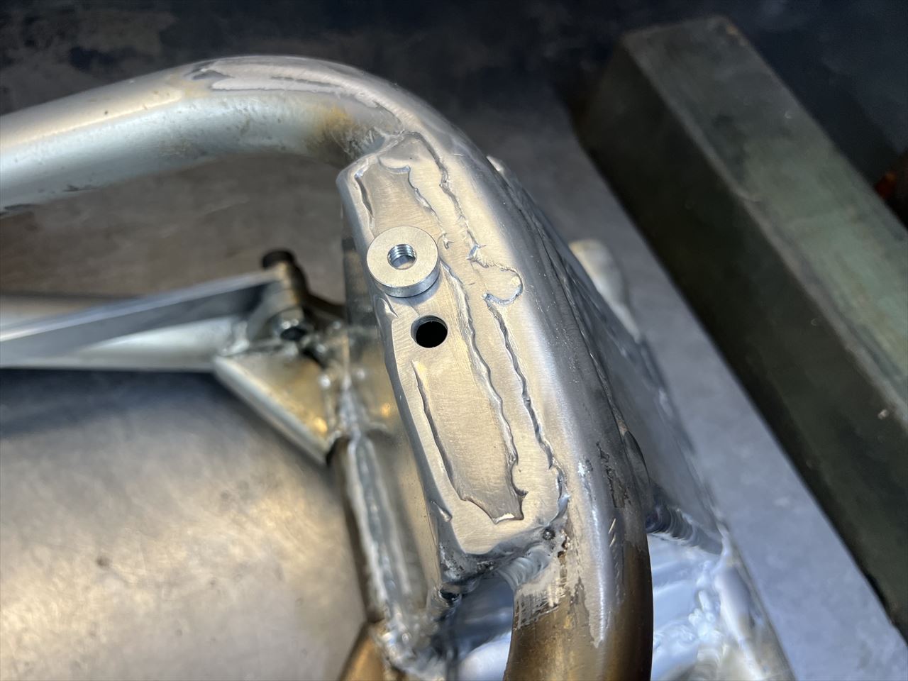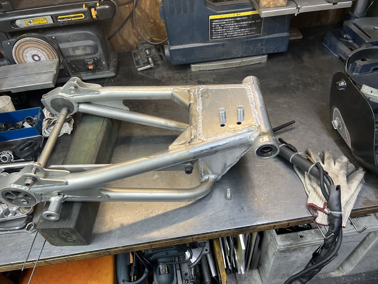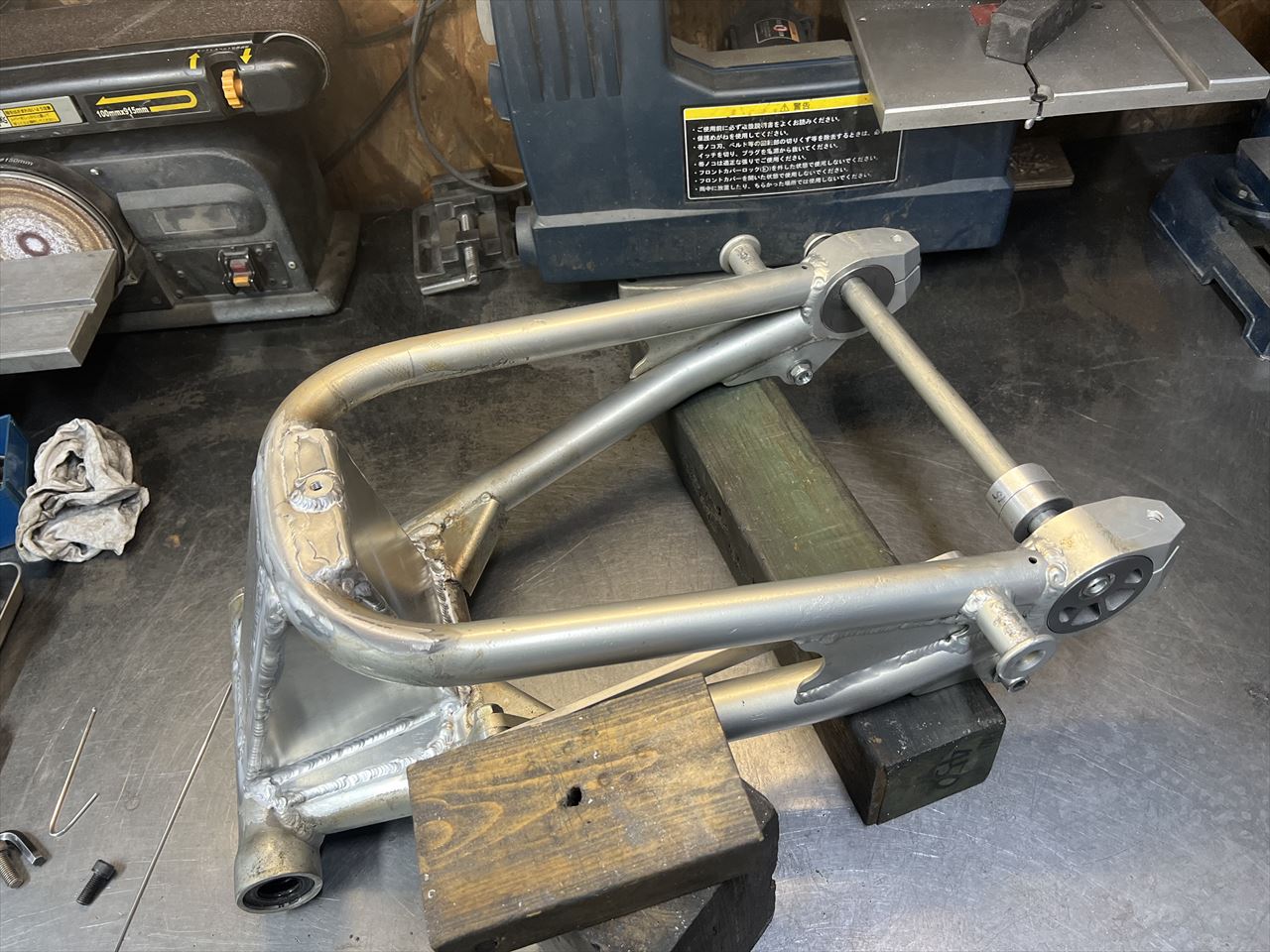 溶接するとこんな感じ。ニップルの寸法、取付位置などもS1スイングアームと同じにしています。