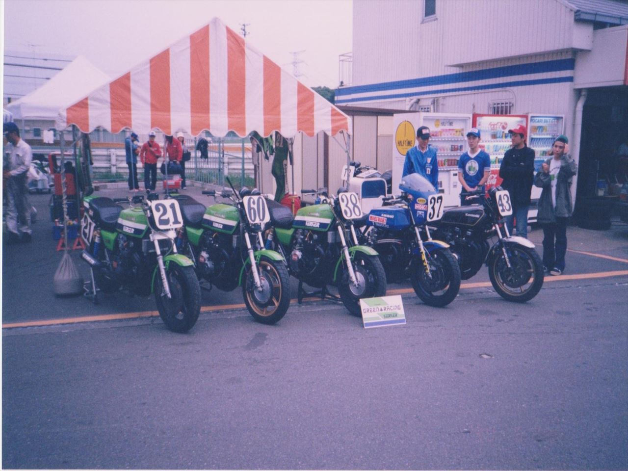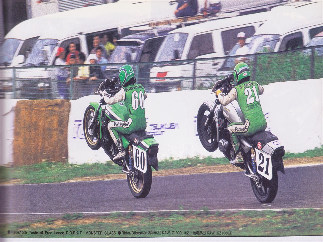 次の写真は翌’96年のものです。タイムも上がってきたのでいよいよMONSTERクラスに参戦開始します。60番がZ1000Jベースの新作マシンです。と同時にこの回は、手前のH2でDOBAR-1クラスにダブルエントリーしました。当時はダブルエントリーする方もそこそこいたものです。