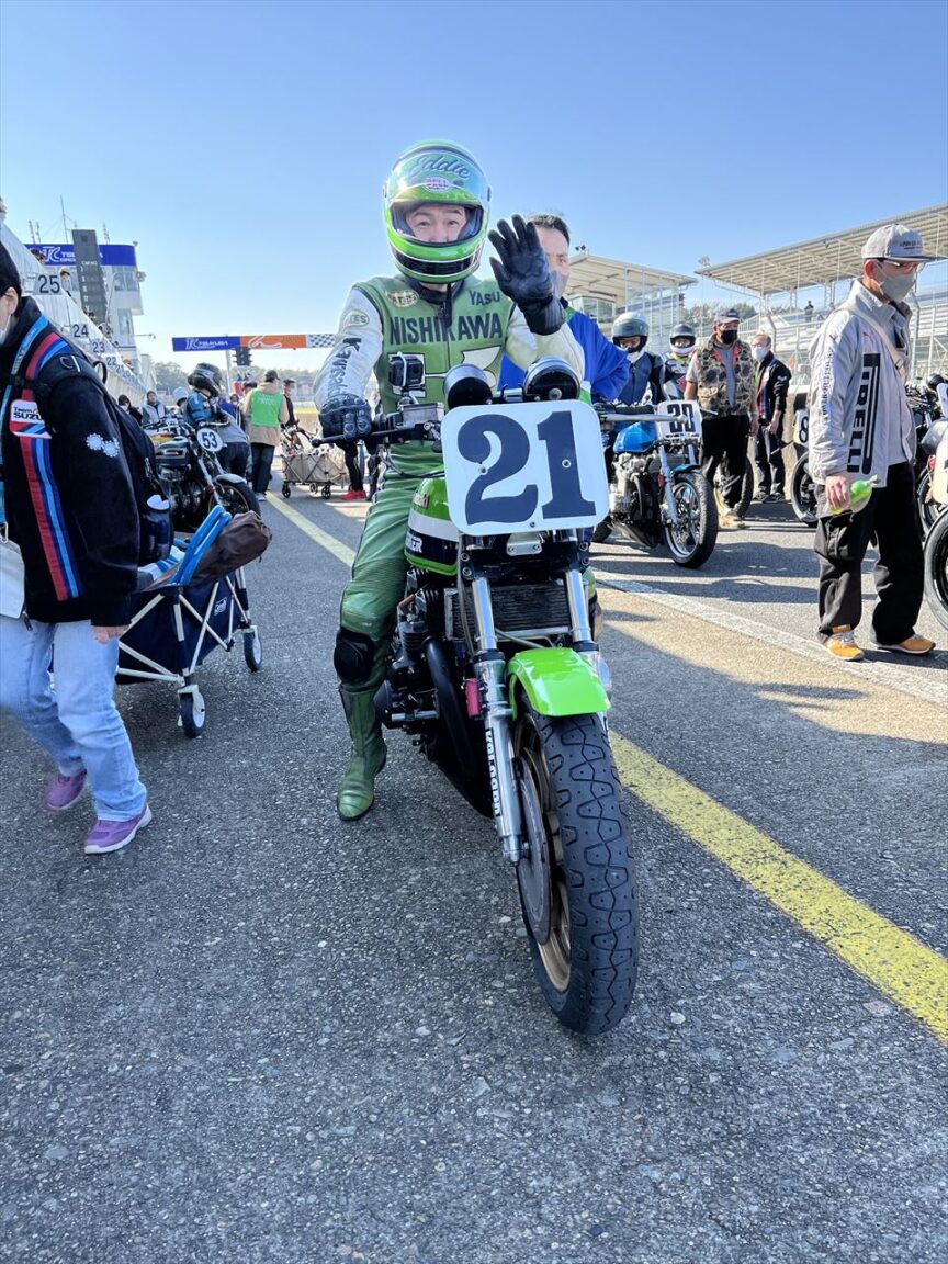 時には別のマシンで走ることも。こちらの写真は2014年のもので、マシンは当時のデモ車であるZ750FXベースのエンジンはMk2という仕様。グリッドはポールではなくてGr.Bのトップです。この日も予選は雨だったので、「雨は得意」と思うようになったのはこの頃でしょうか。