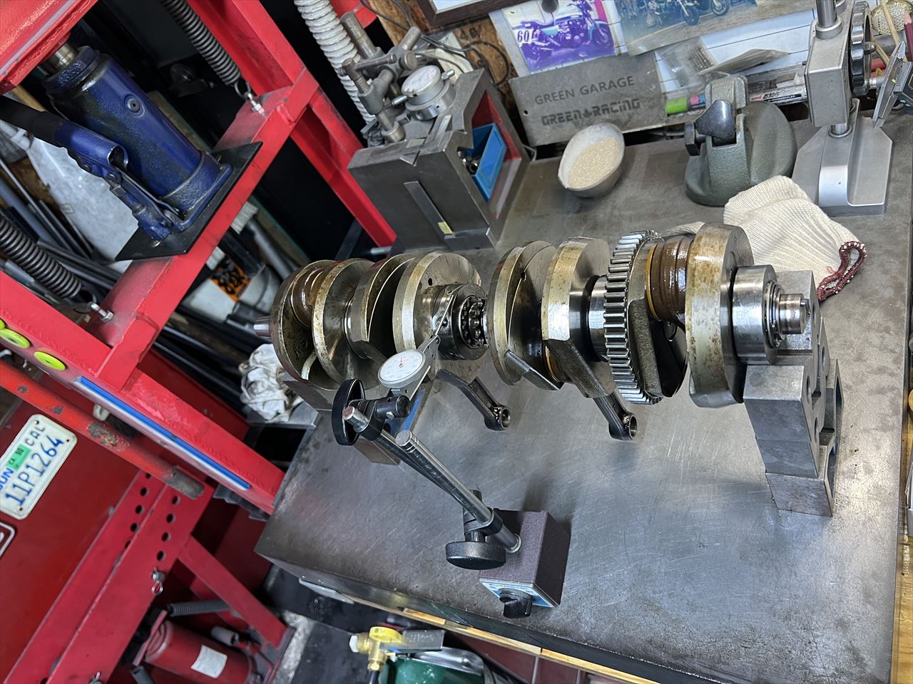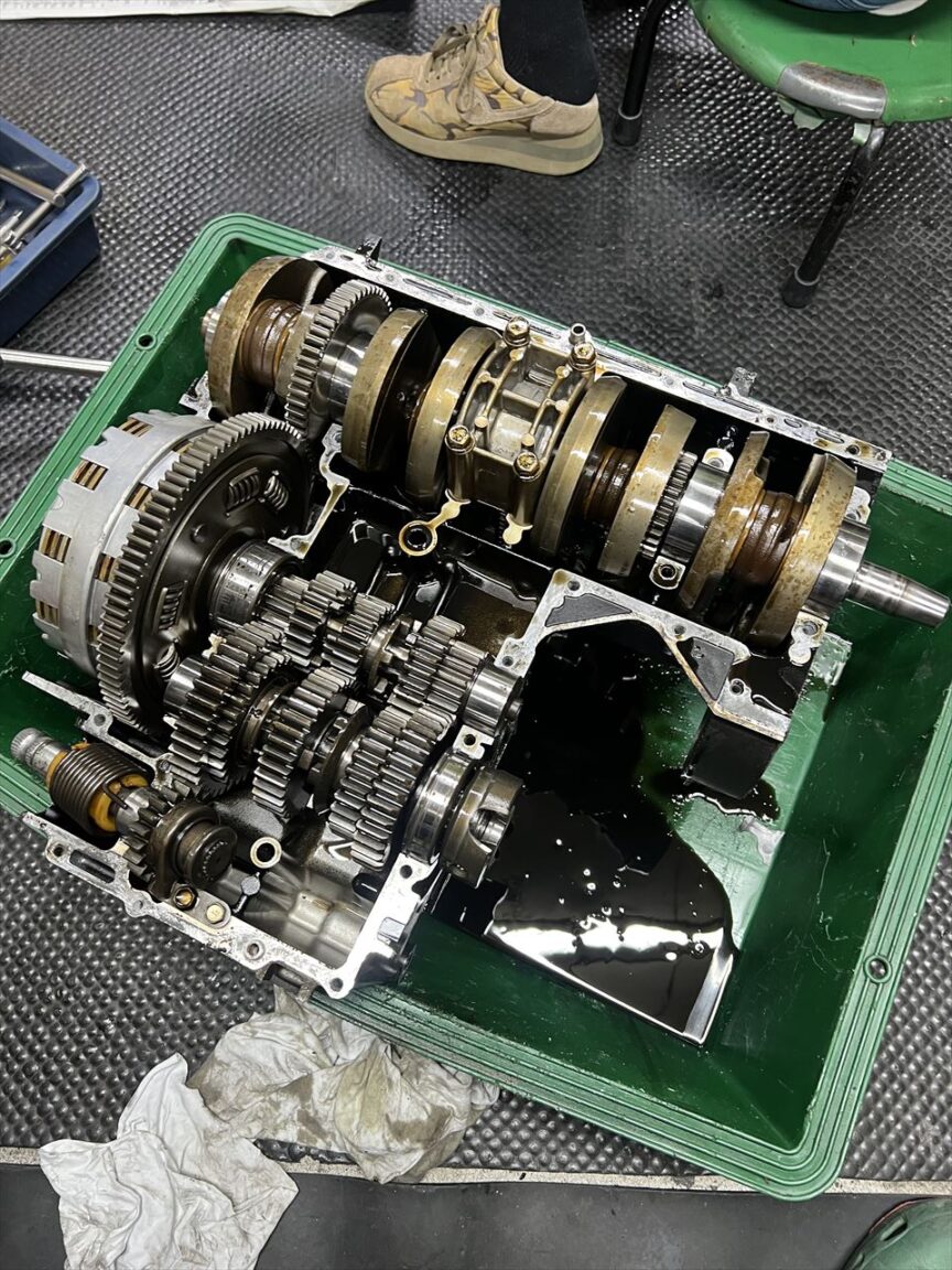 クランクケースを分解します。クランクの回転はスムーズで、ミッション周りも摩耗は少なく良好です。