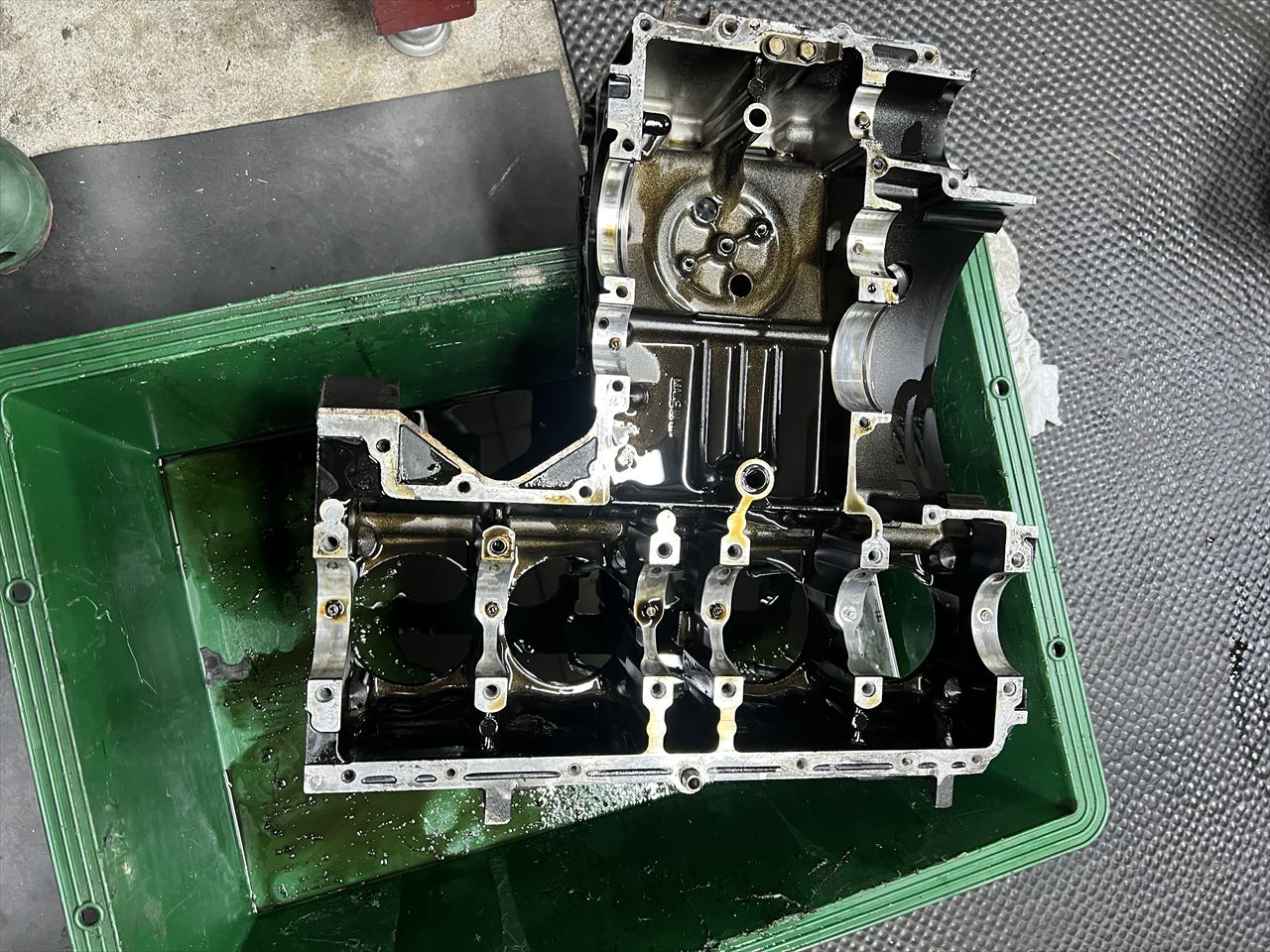 オイルパンを外します。スラッジの堆積は少な目です。特に異物は無いようです。