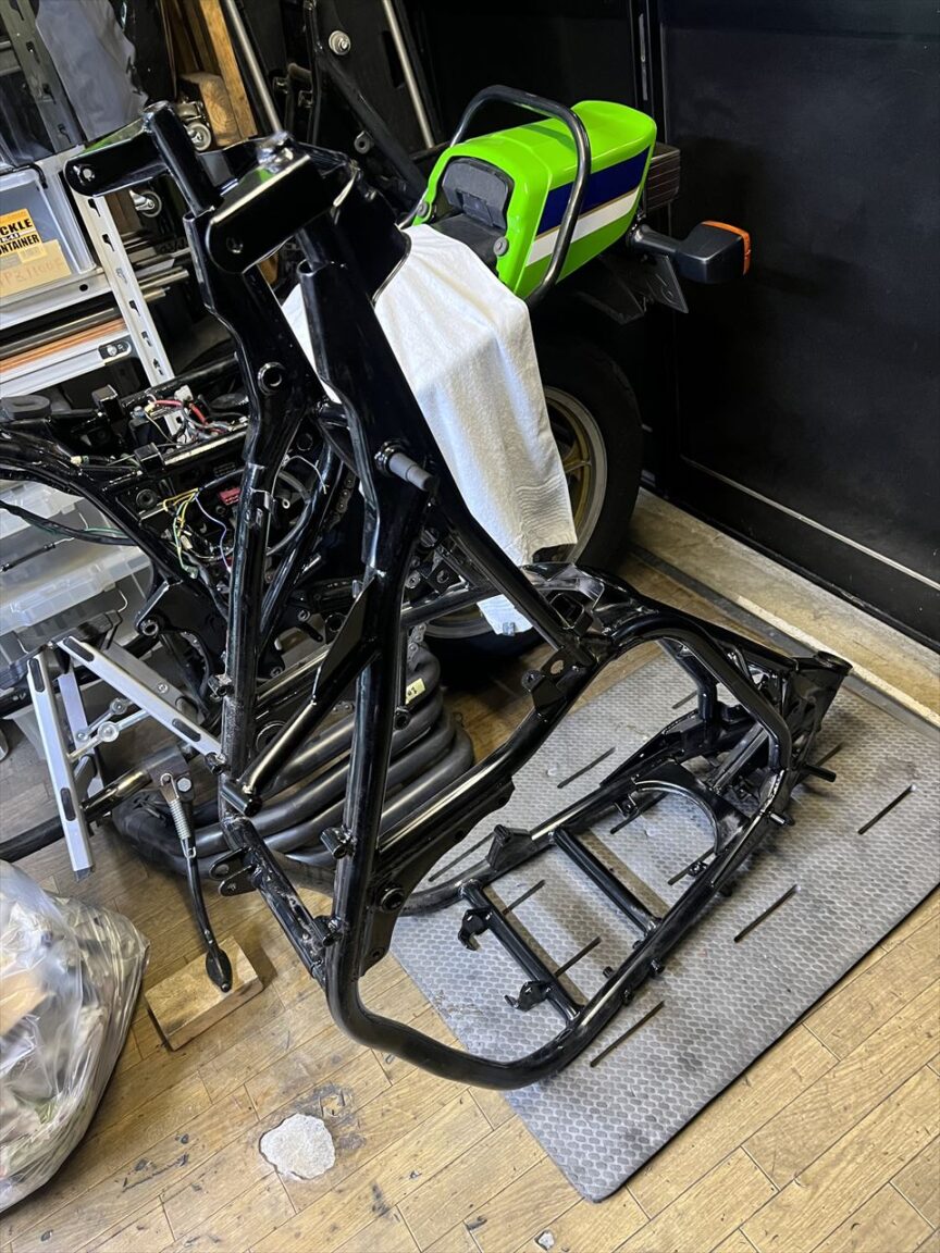 同じワークスS1仕様に使うフレームはこちら。シートレールカットなどの加工を全て行ったうえで塗装したものです。手配中の残りの部品はS1インナーローターなどごくわずか。着々と部品が整ってきました。