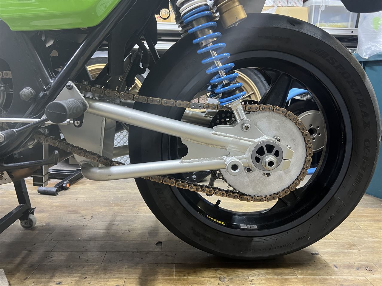 変更するスイングアームはこちら。ZRX400ベースで、2022年バージョンとしてキャッチタンクまで装着した最新バージョンです。入庫してS1仕様可中のお客様用と、過去バージョンのZRX400改S1スイングアームに追加工でキャッチタンクを追加したもの、合計3セット昨年暮れに製作しました。そのうちの1本を使います。