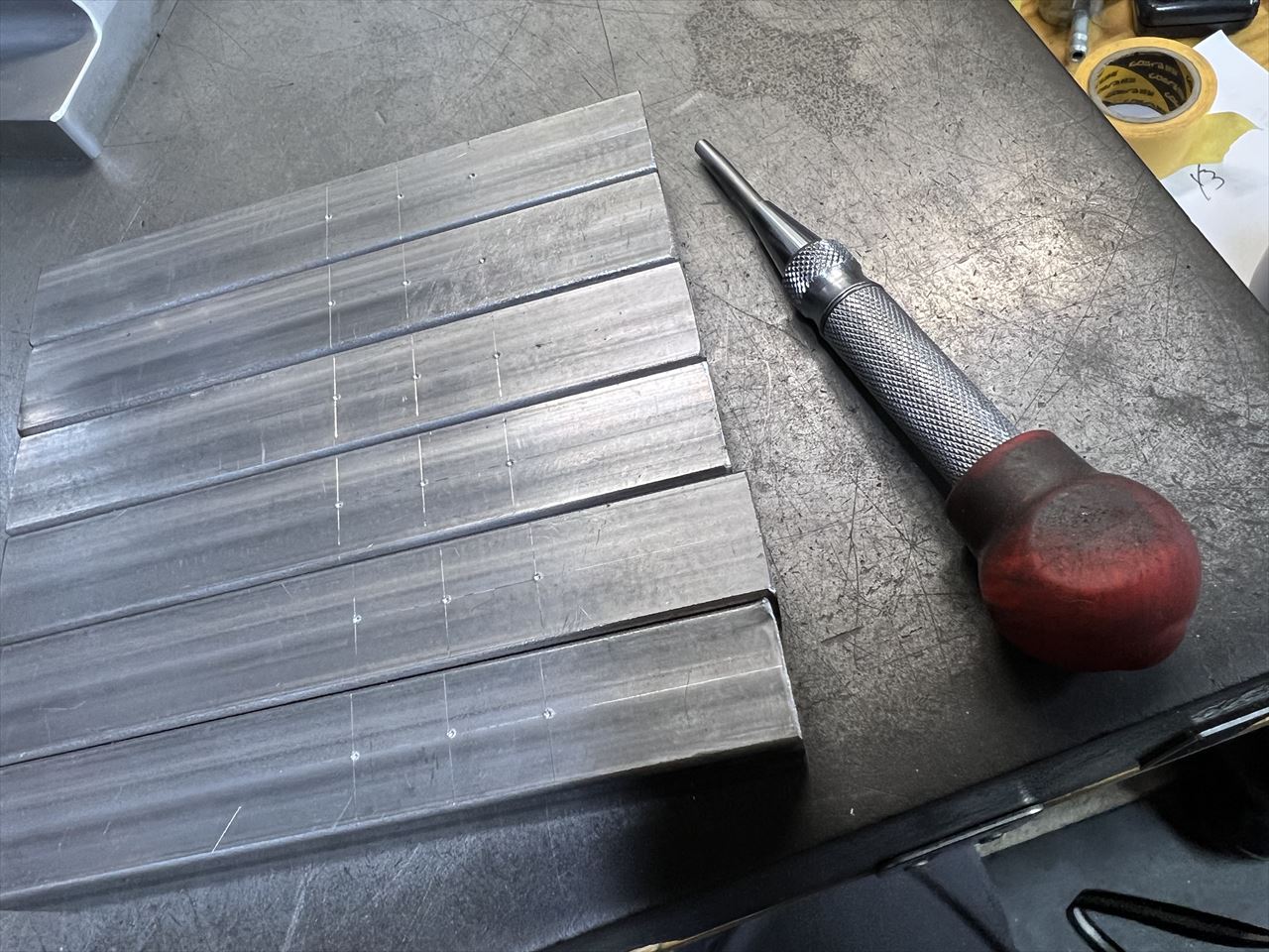 穴開けの位置をケガいてマークします。この手のケガキはハイトゲージを使って一度に行うと便利です。