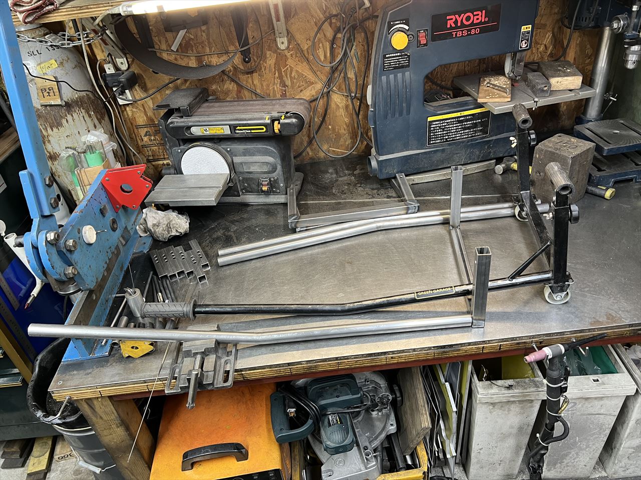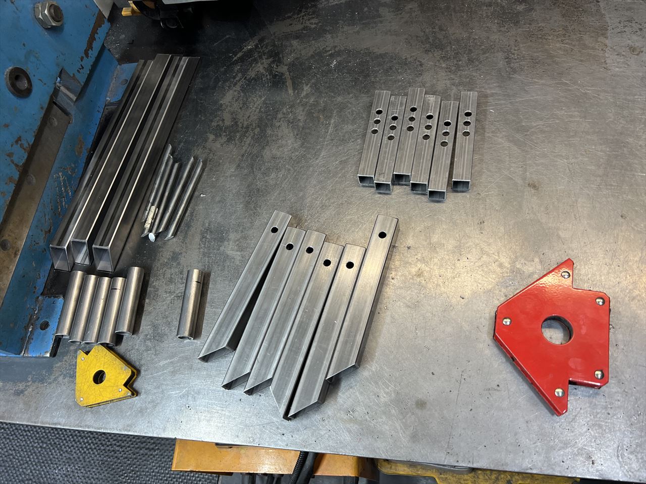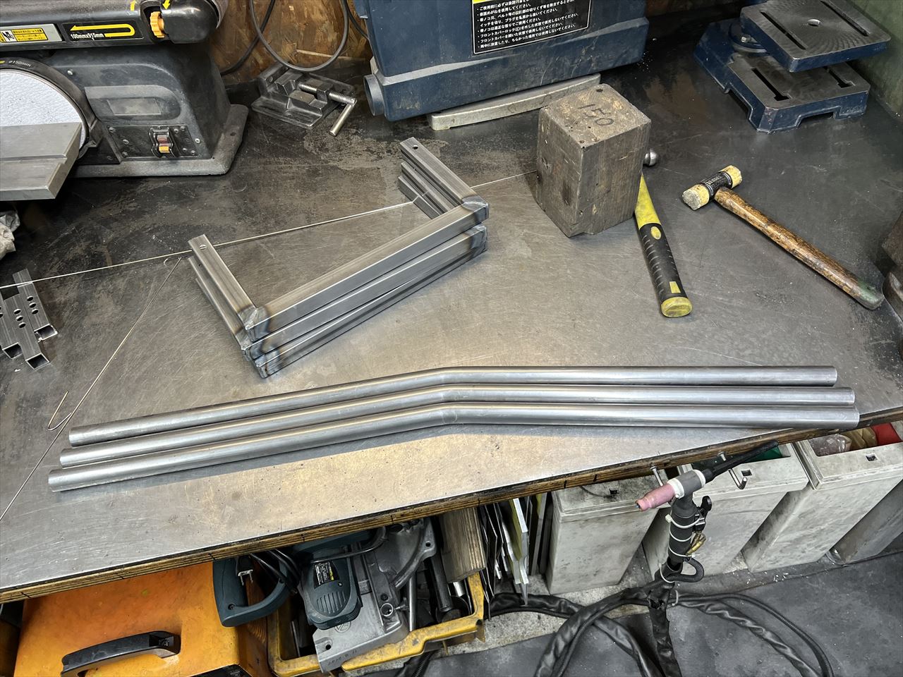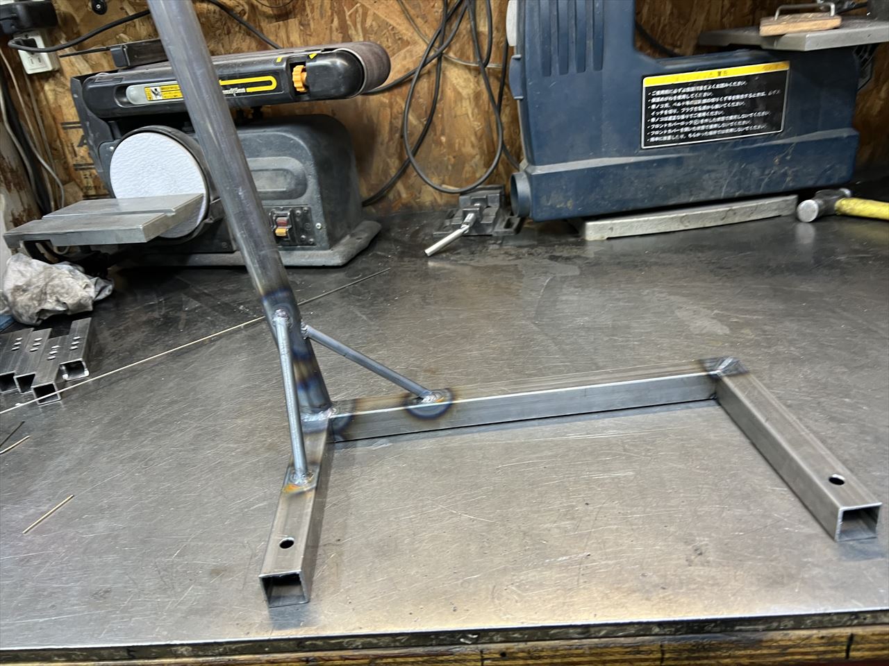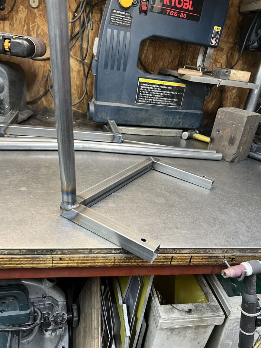 右腕のリハビリも兼ねて、軽めの作業を再開します。先ずはバックオーダーをいくつかいただいているフレームスタンドを製作します。今回は、前回の製作時に切り出しておいた3台分を先ず作ります。