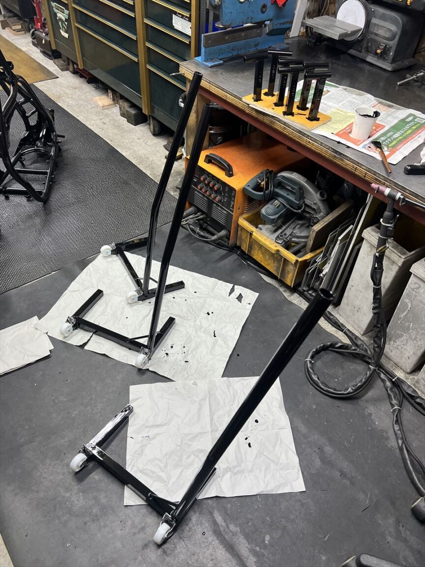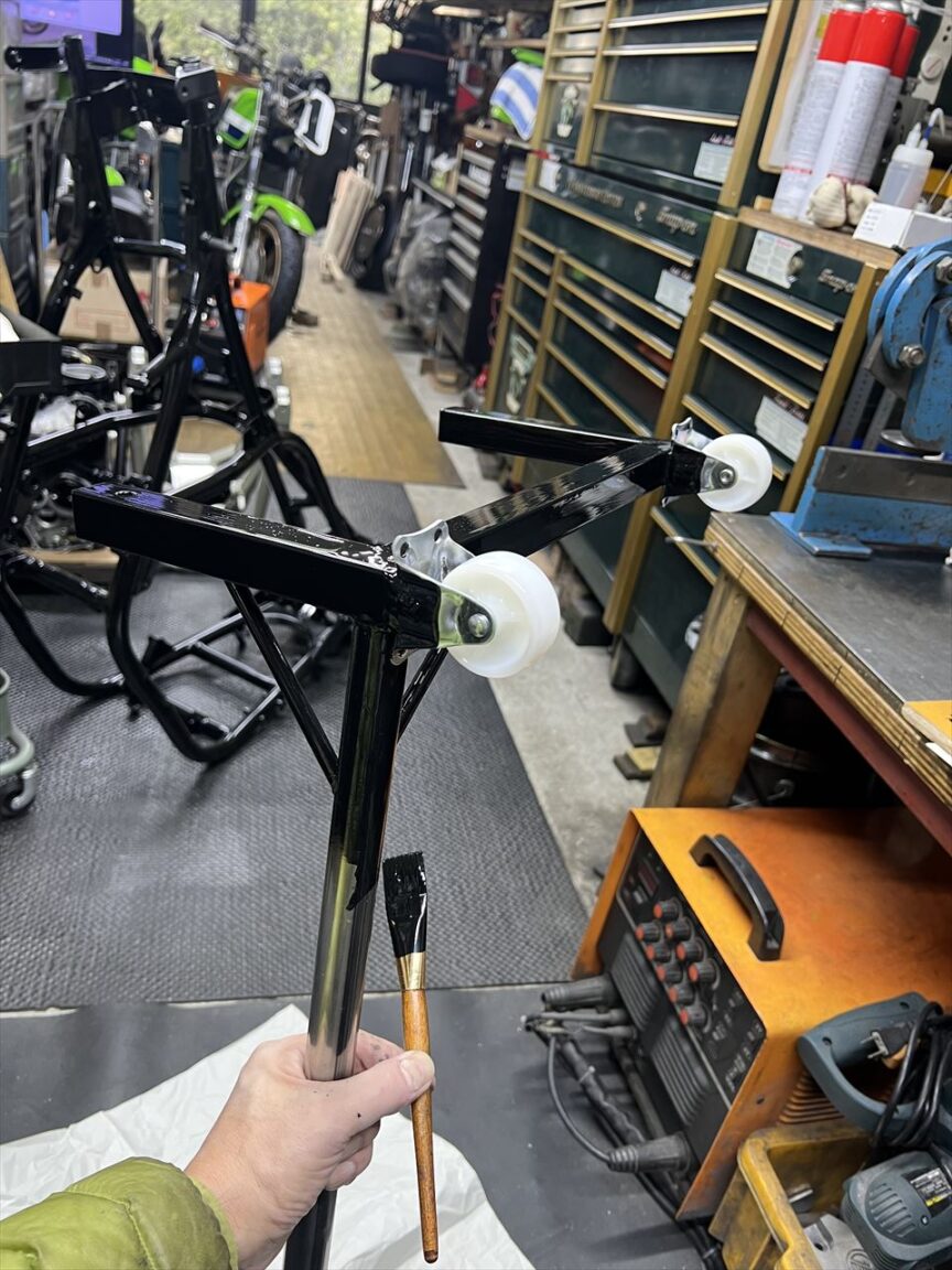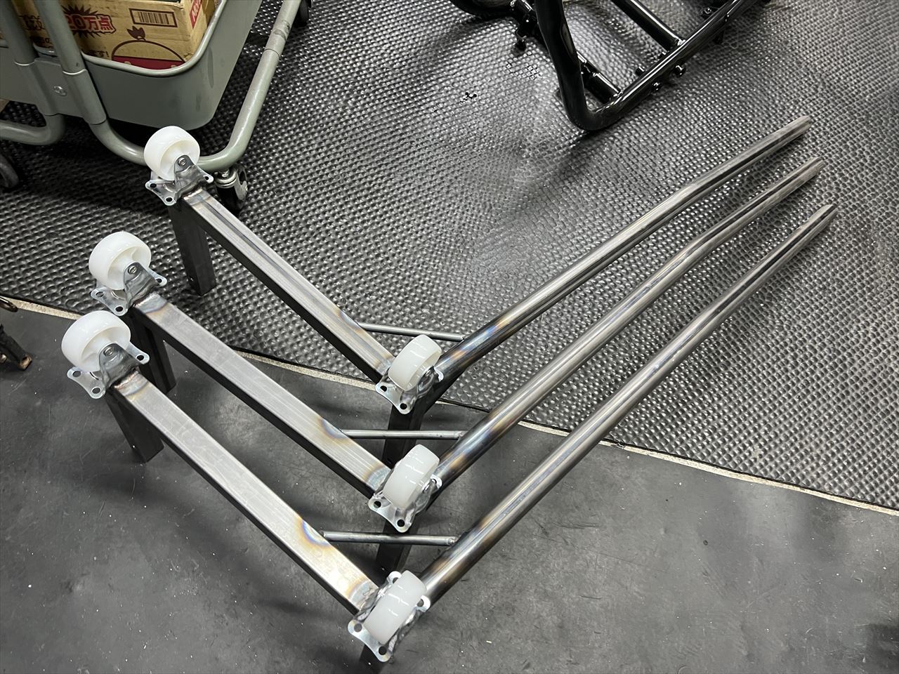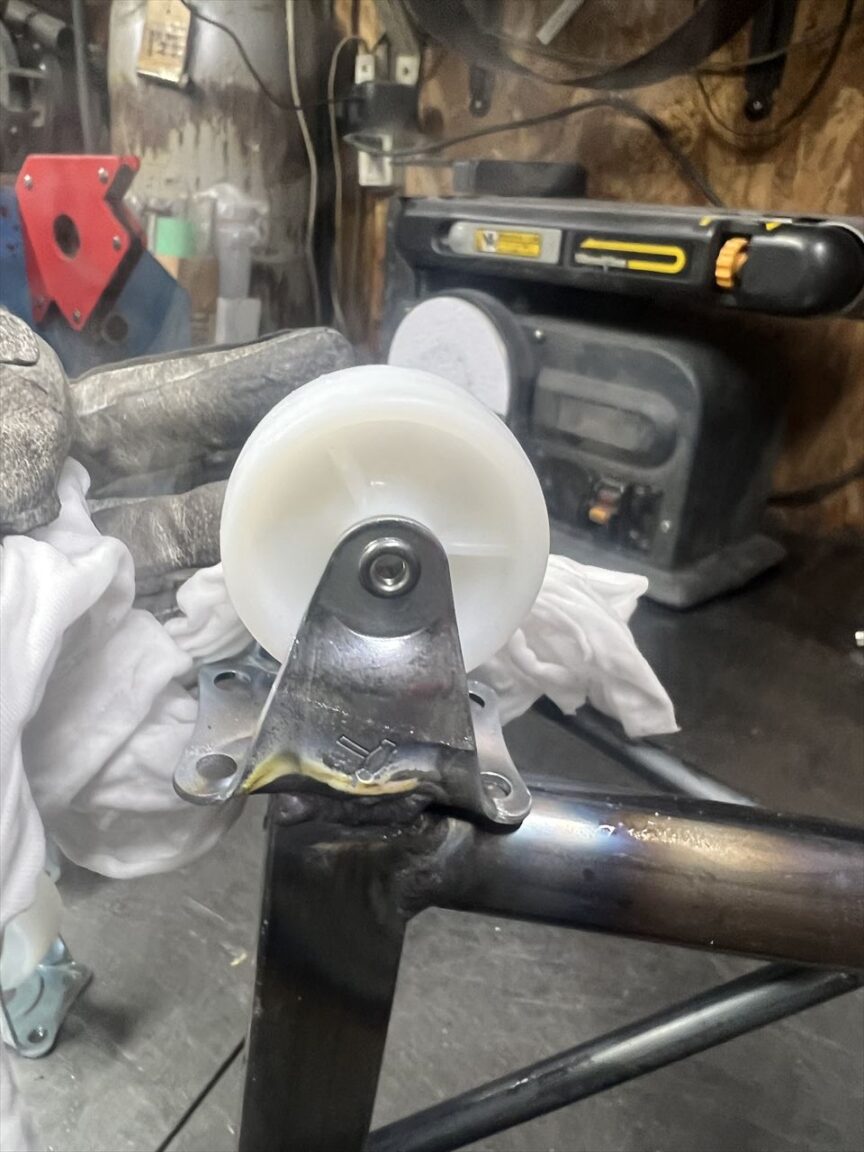 溶接後はこんな感じ。弊社で15年ほど使っているスタンドの車輪もこれと同じナイロン製ですが、今のところ割れたりなどのトラブルはありません。