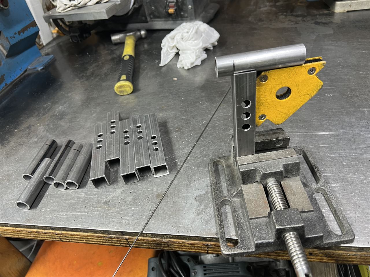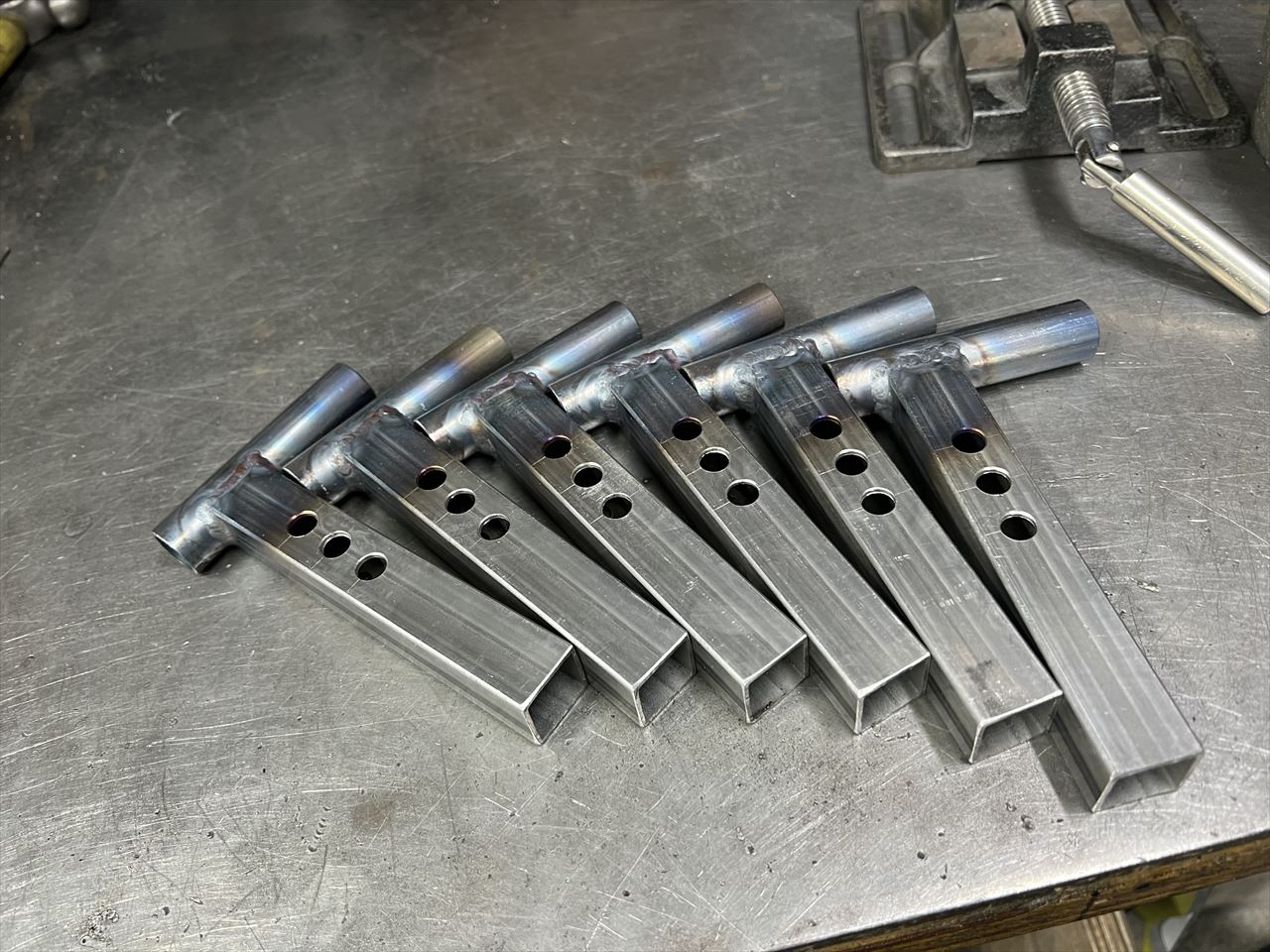 続いてフレーム受けの部分です。高さ調整の穴が3カ所あります。そこに横棒を溶接します。