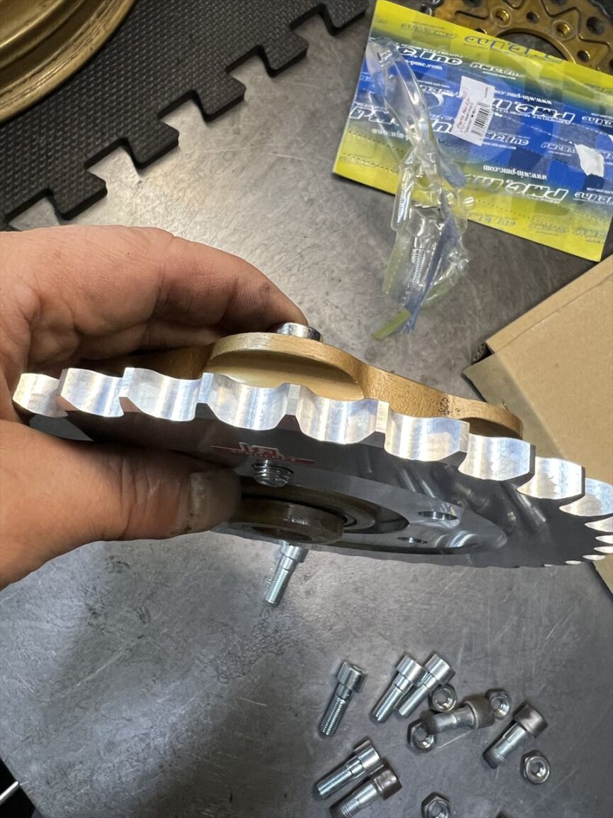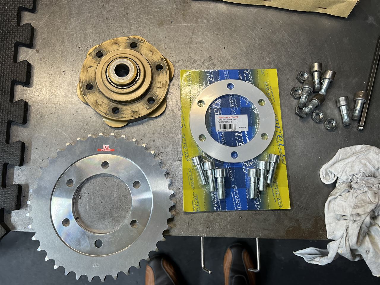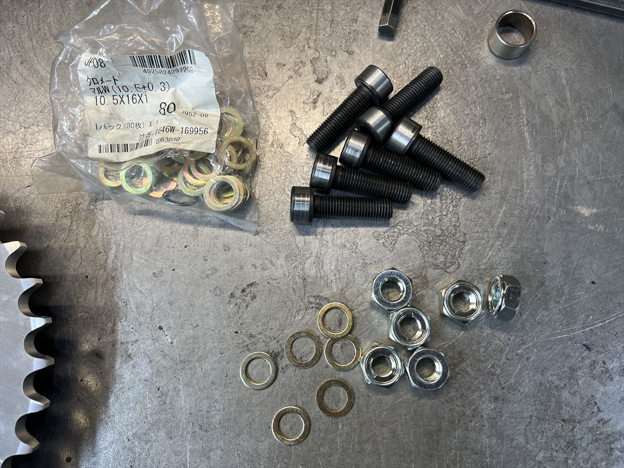 5ミリ長いスプロケボルトが準備できました。ナットも薄型が使用されていたので、普通のタイプに変更します。因みに薄型ナットは許容トルクが足りなくなるので、リヤスプロケ固定には使用しない方がいいでしょう。
