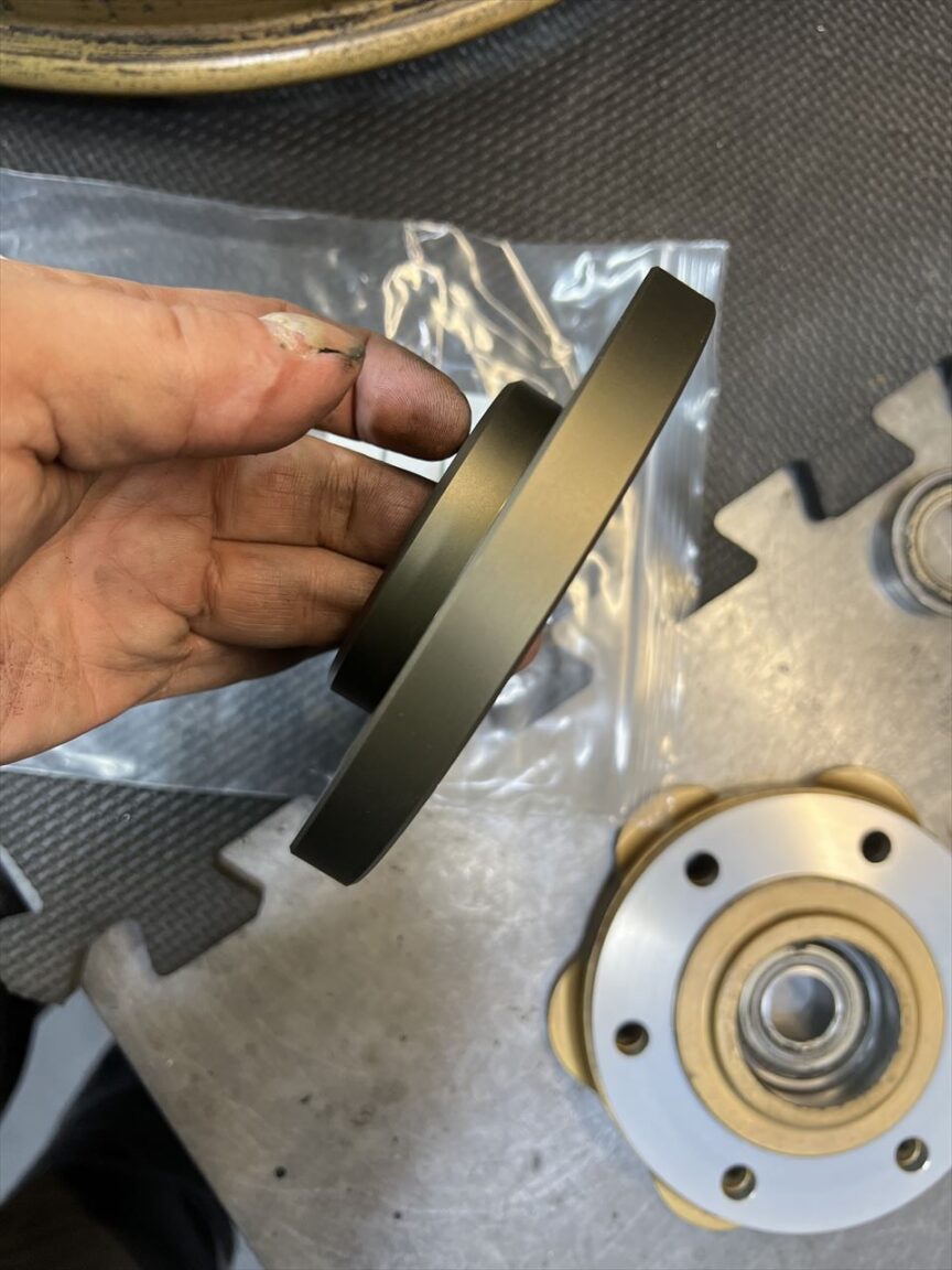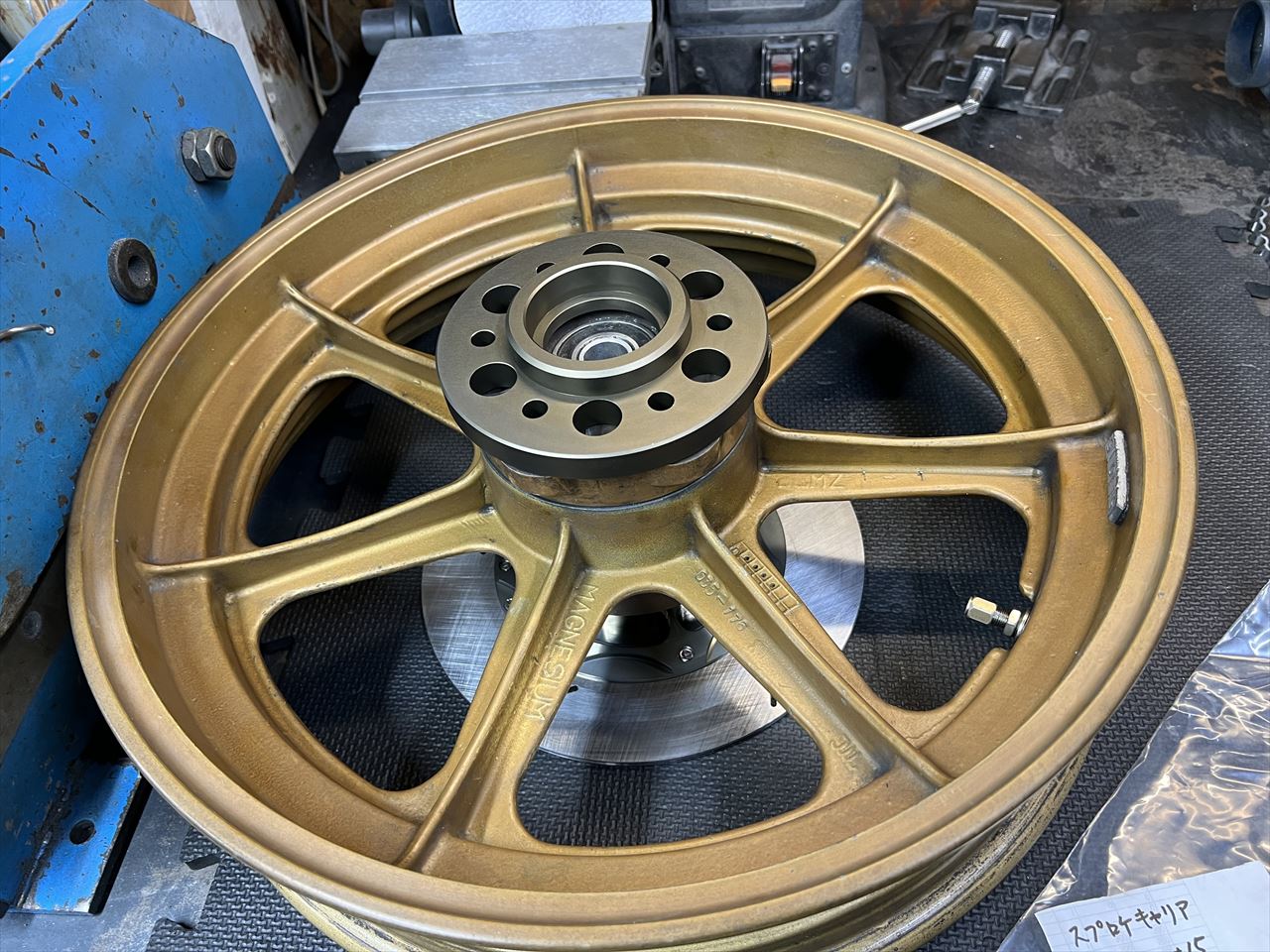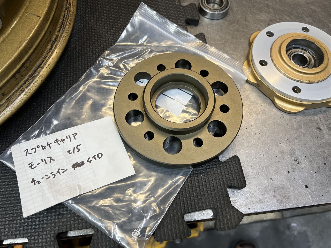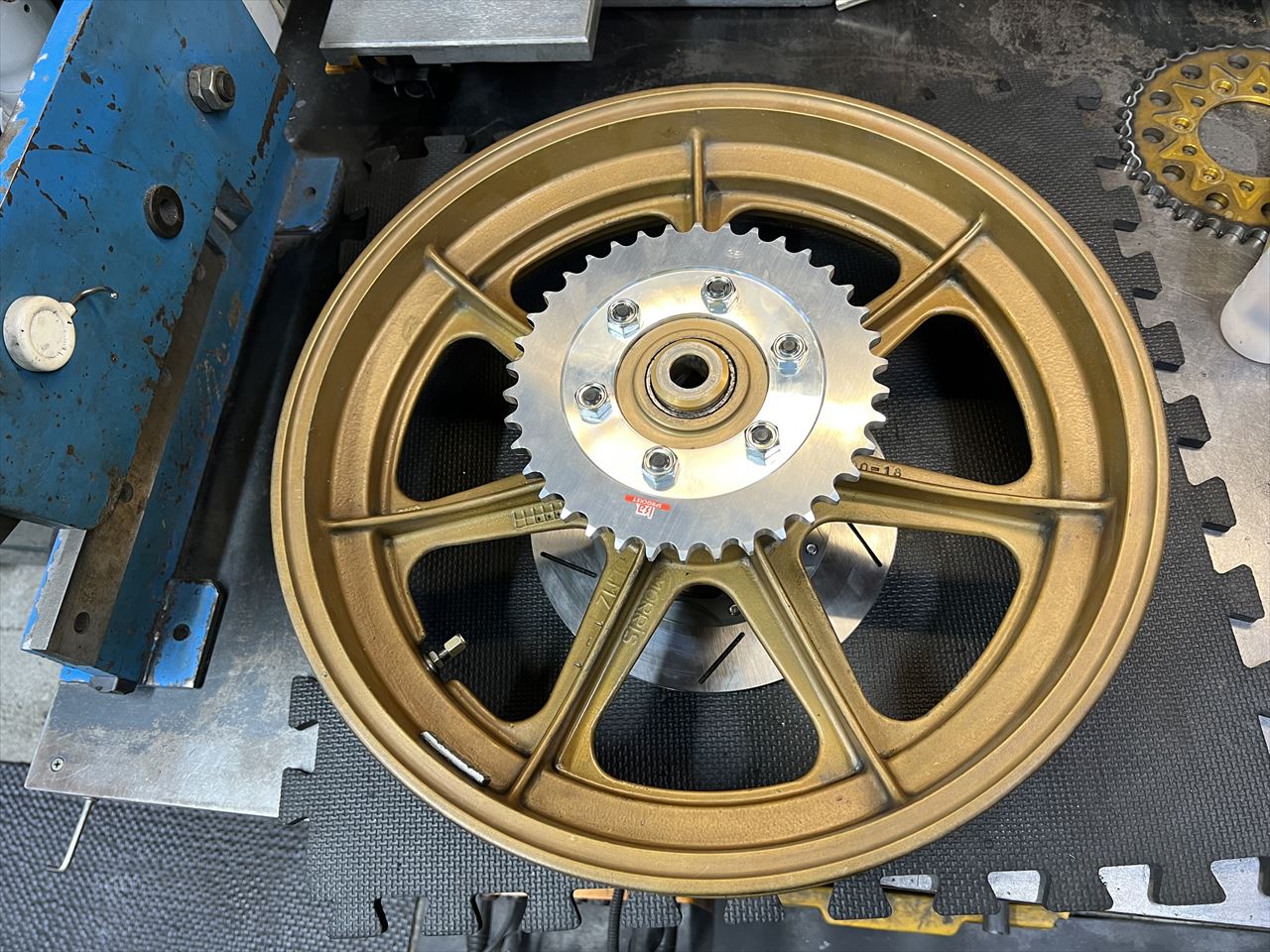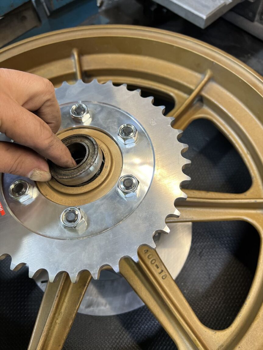 ダンロップのα14Z 150/70-18 を履けるよう、チェーンラインを5ミリほどオフセットしたいので、PMC製のスペーサーを使います。リヤスプロケは弊社のソリッドタイプを使用。