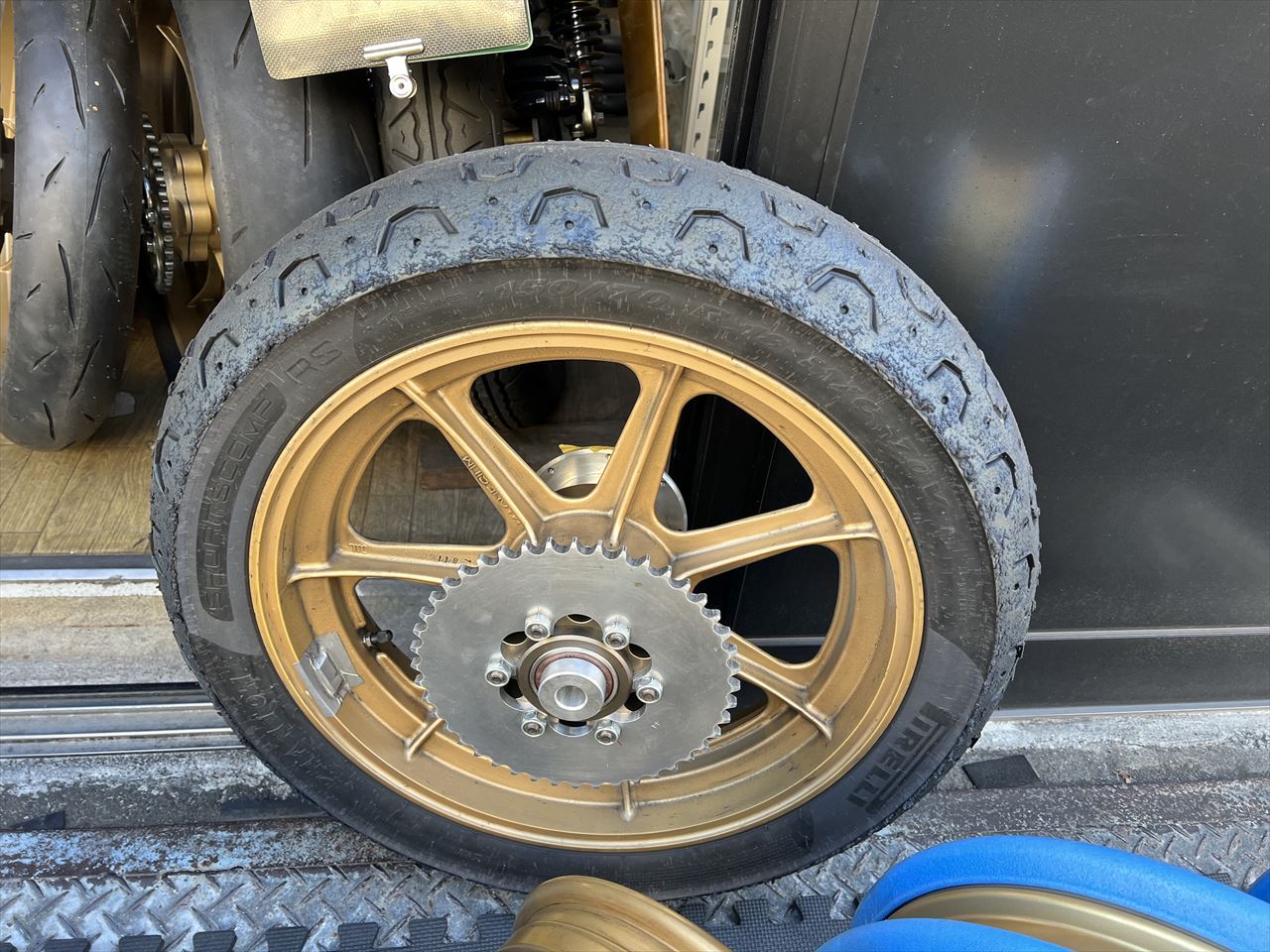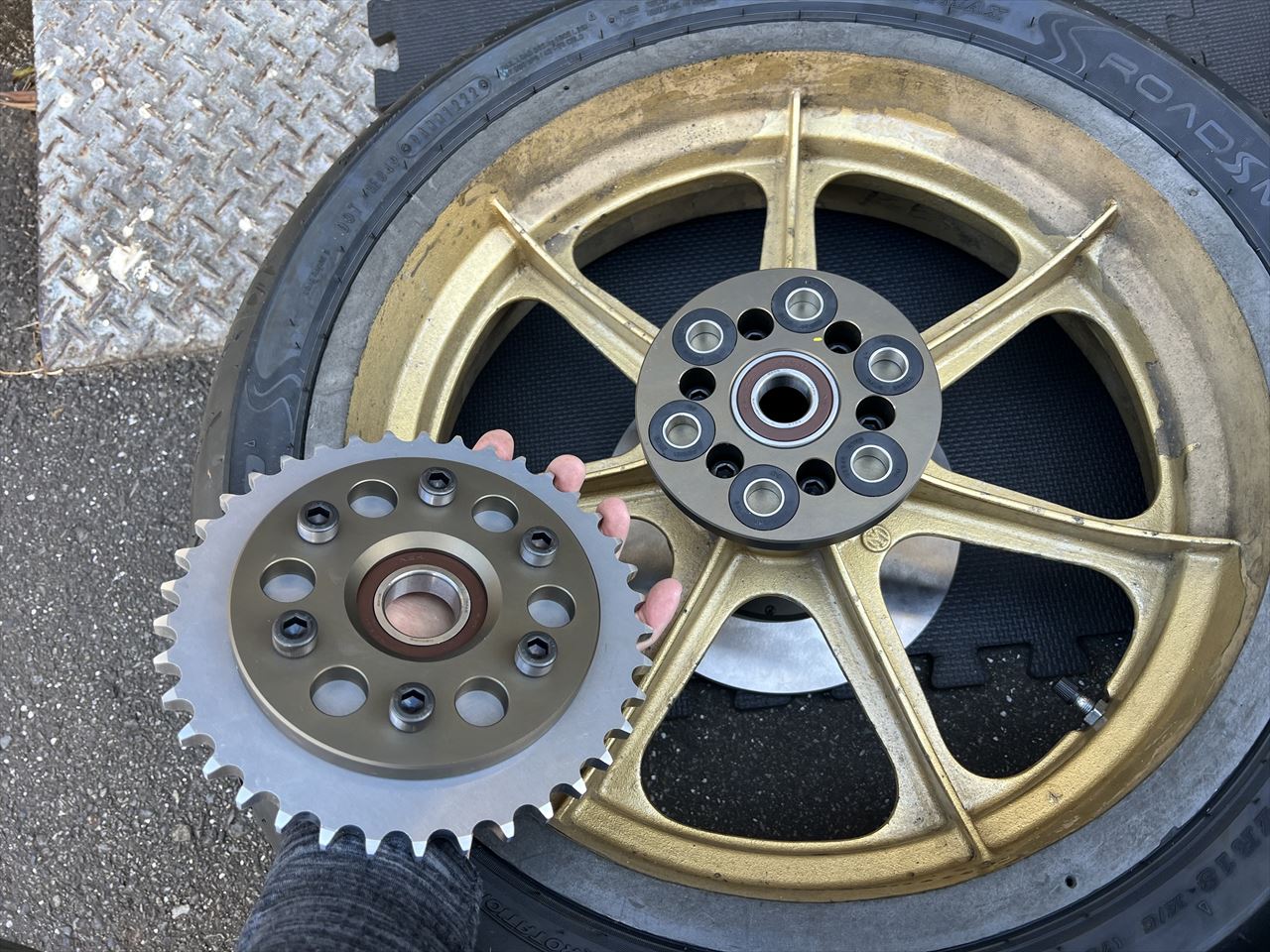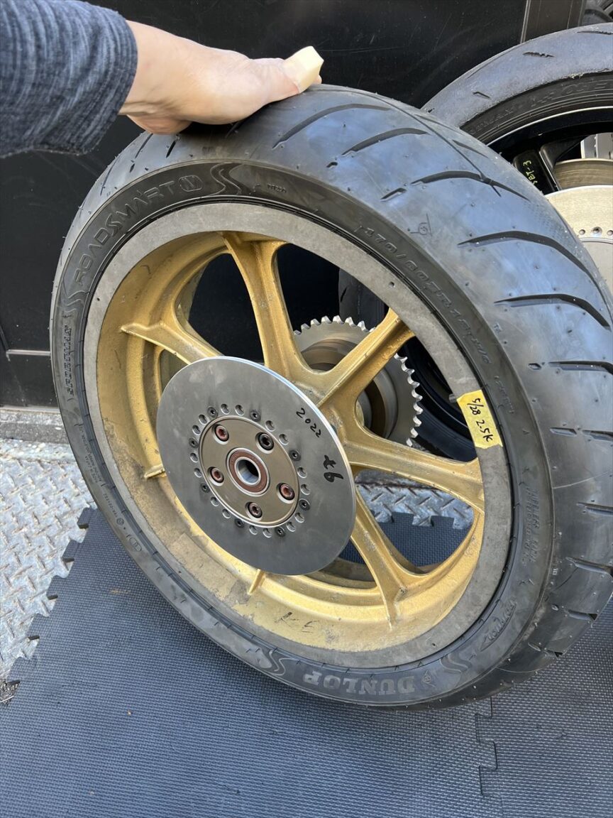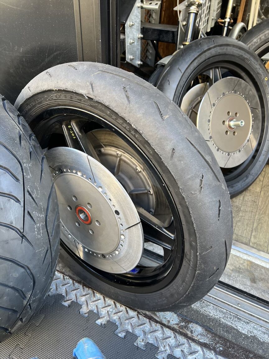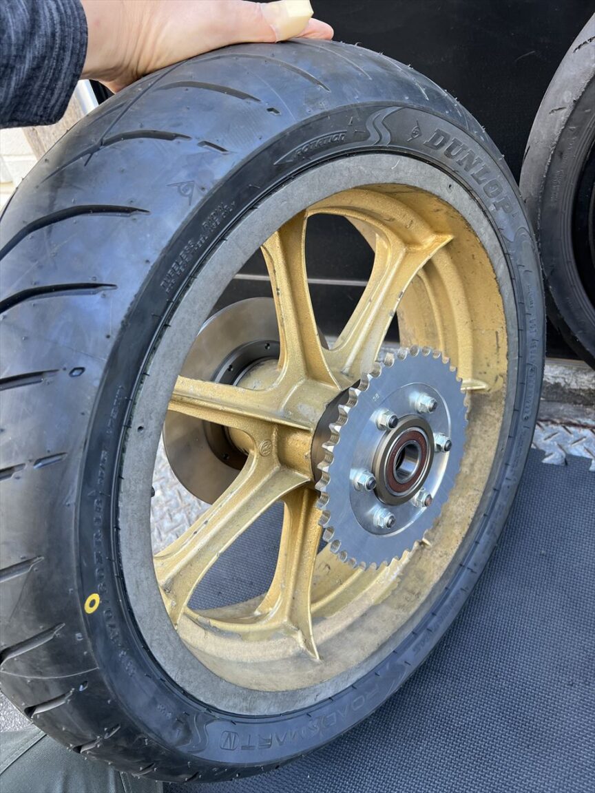 こちらは1000Jレーサーで使っているリヤホイールで、ハイポイント製です。スプロケキャリアは前回破損したので、ベアリングをサイズアップした対策品を製作してセットしてあります。