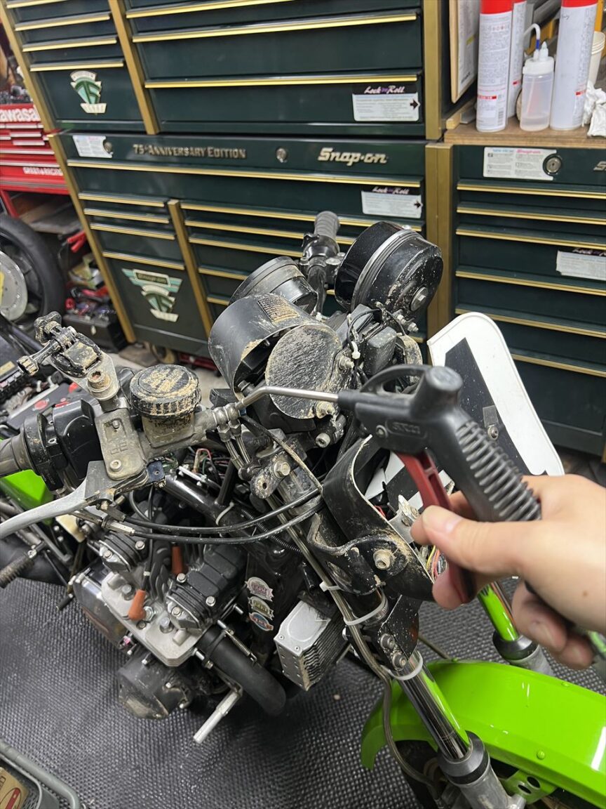 メーター周りに残る土や小石をエアブローします。