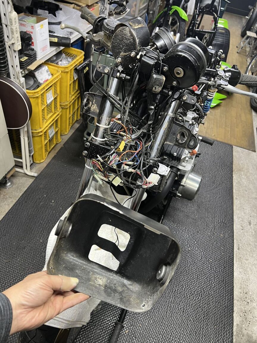 メーター周りを分解します。FRPライトケースは割れていないようですが少し変形しています。
