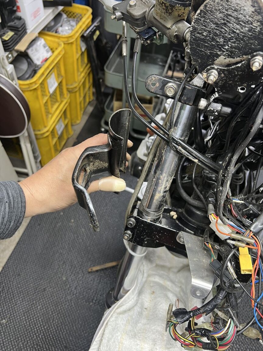半割れ加工してバンド止めしてあったヘッドライトステーは、ステーが少し曲がっていますが十分直せるレベルです。