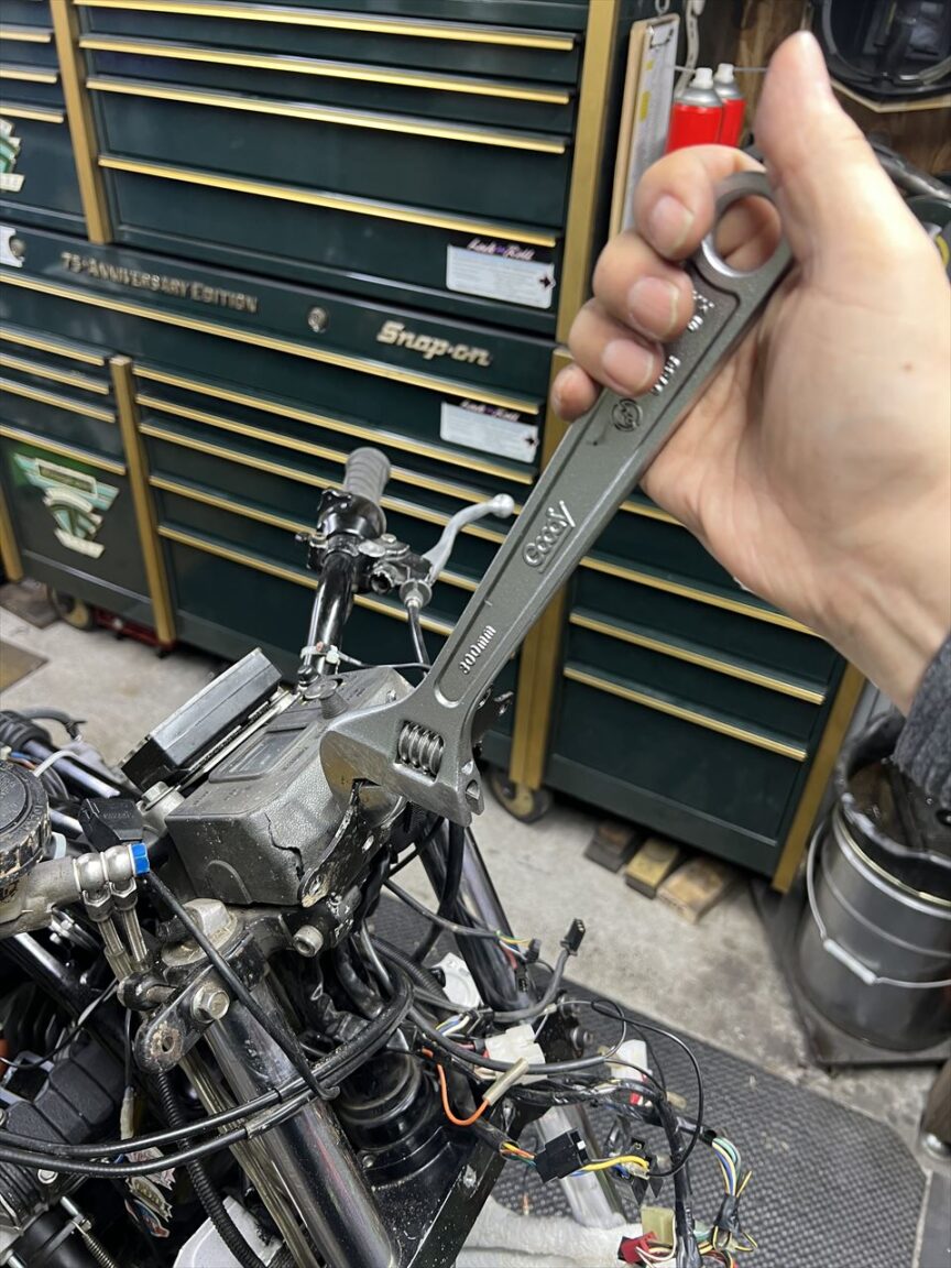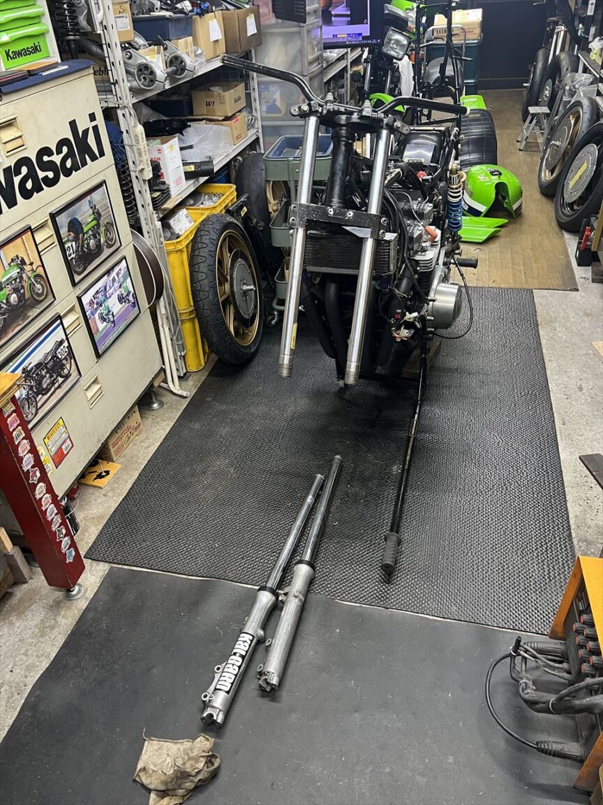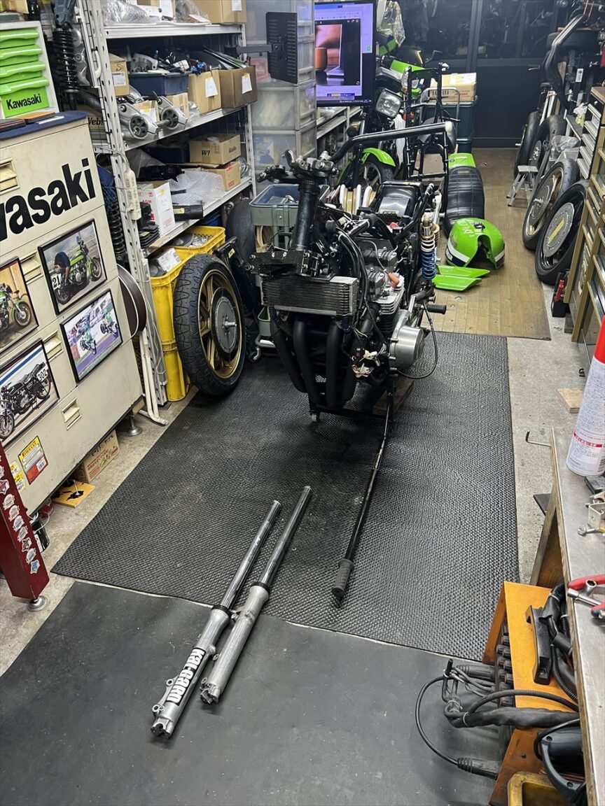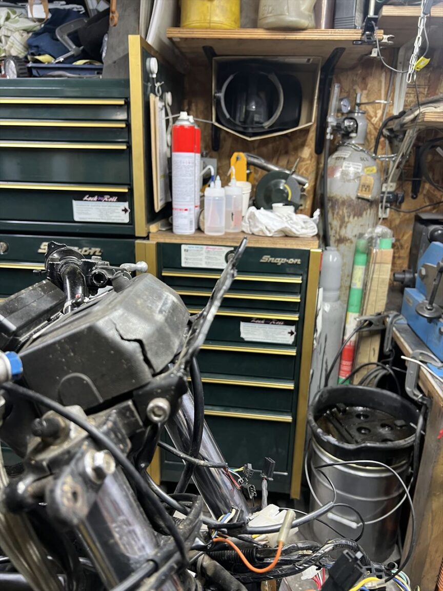 昨年10月5日の筑波サーキット最終コーナーでの転倒から5ヵ月余り。転倒で痛めた右肩の調子もだいぶ戻ってきたところで分解点検します。