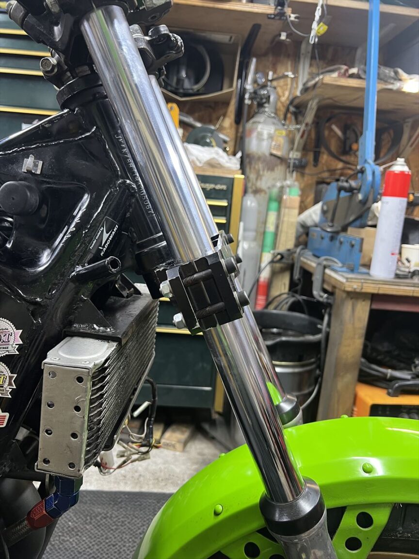 インナーチューブを上げていくと、アッパーステムの穴とは少しズレているのがわかります。横から見ると左右のチューブが並行でないこともわかります。S1ステムは少し曲がっていますね。