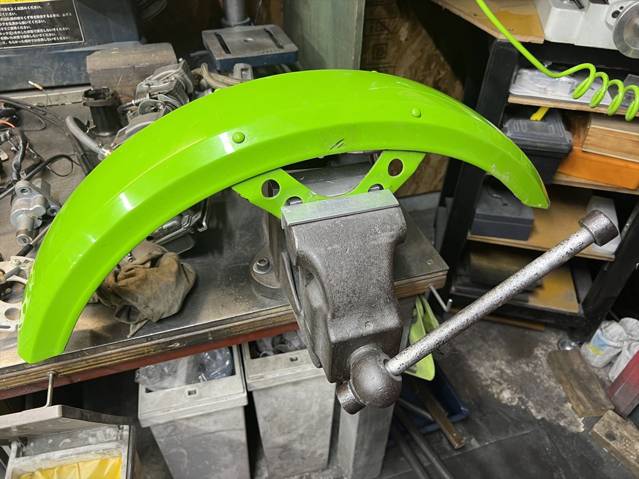ステーの曲がりをバイスを使って修正します。