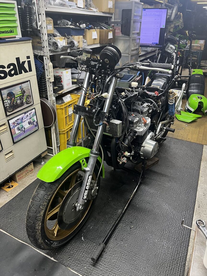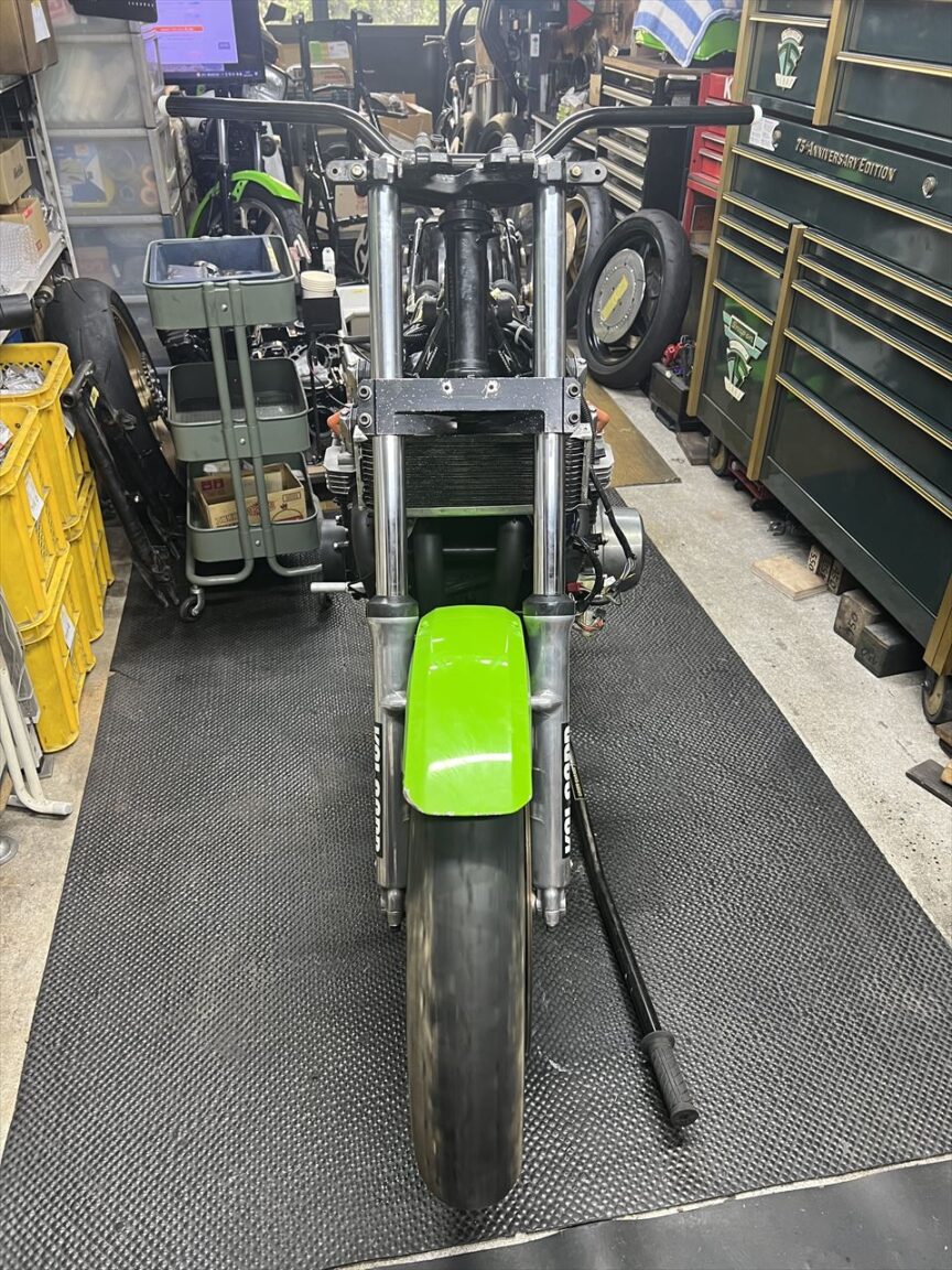 ハンドルも新品交換。フェンダーとホイールを取り付けます。