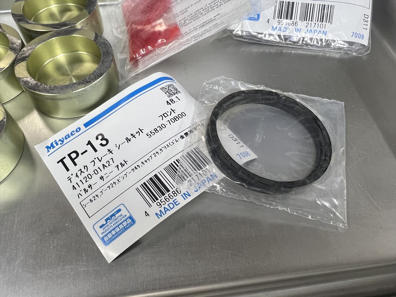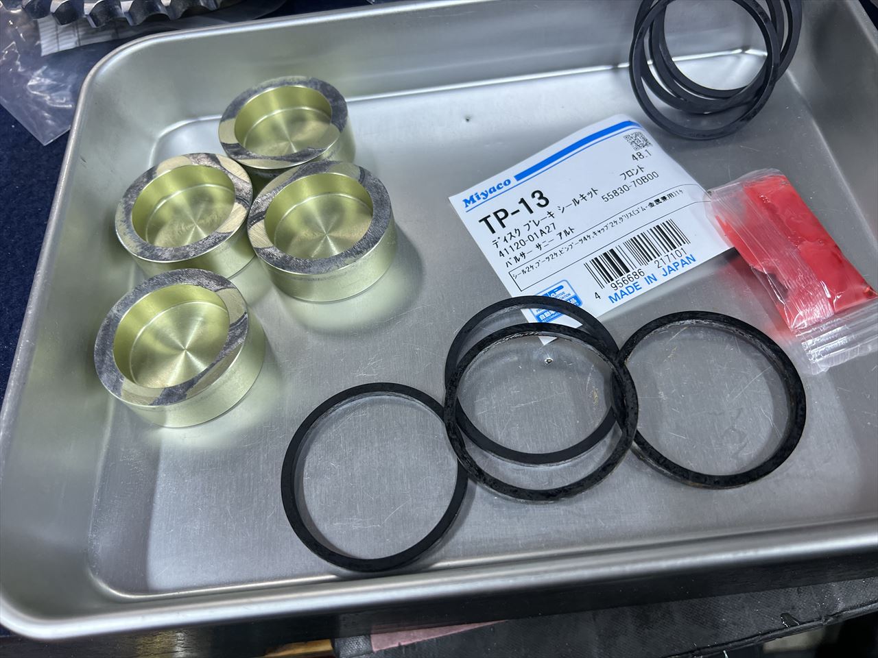 シールは新品交換します。S1キャリパー用は予備が無いので、代用品として自動車用のリプレイスパーツを使います。