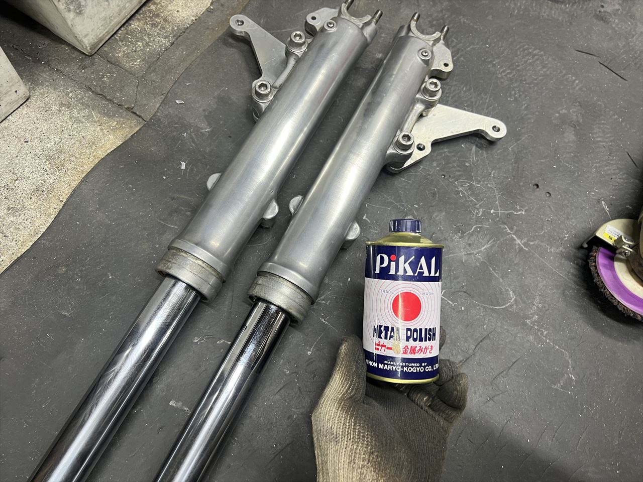 研磨後にナイロンたわしでヘアラインを付け、最後にピカールでもう一度軽く研磨して完成です。