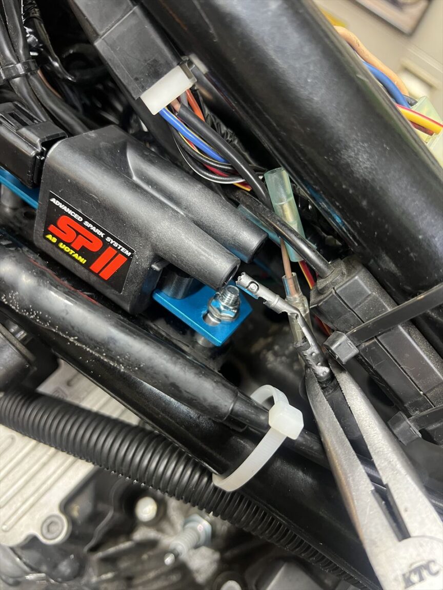 ウオタニSP2コイルにコードを接続する際は、コイル側のターミナルはこの中間のくびれ部分まで挿入します。