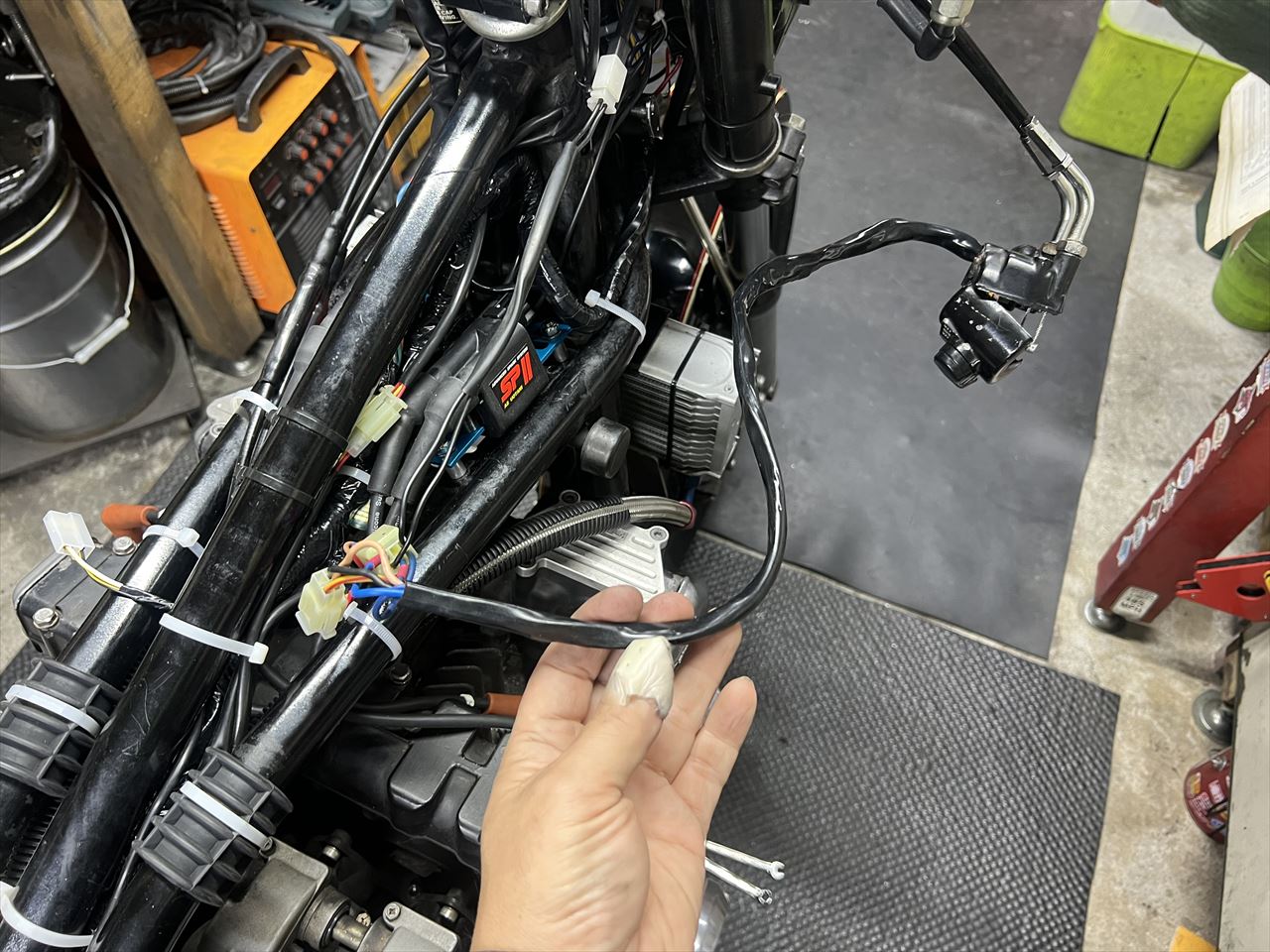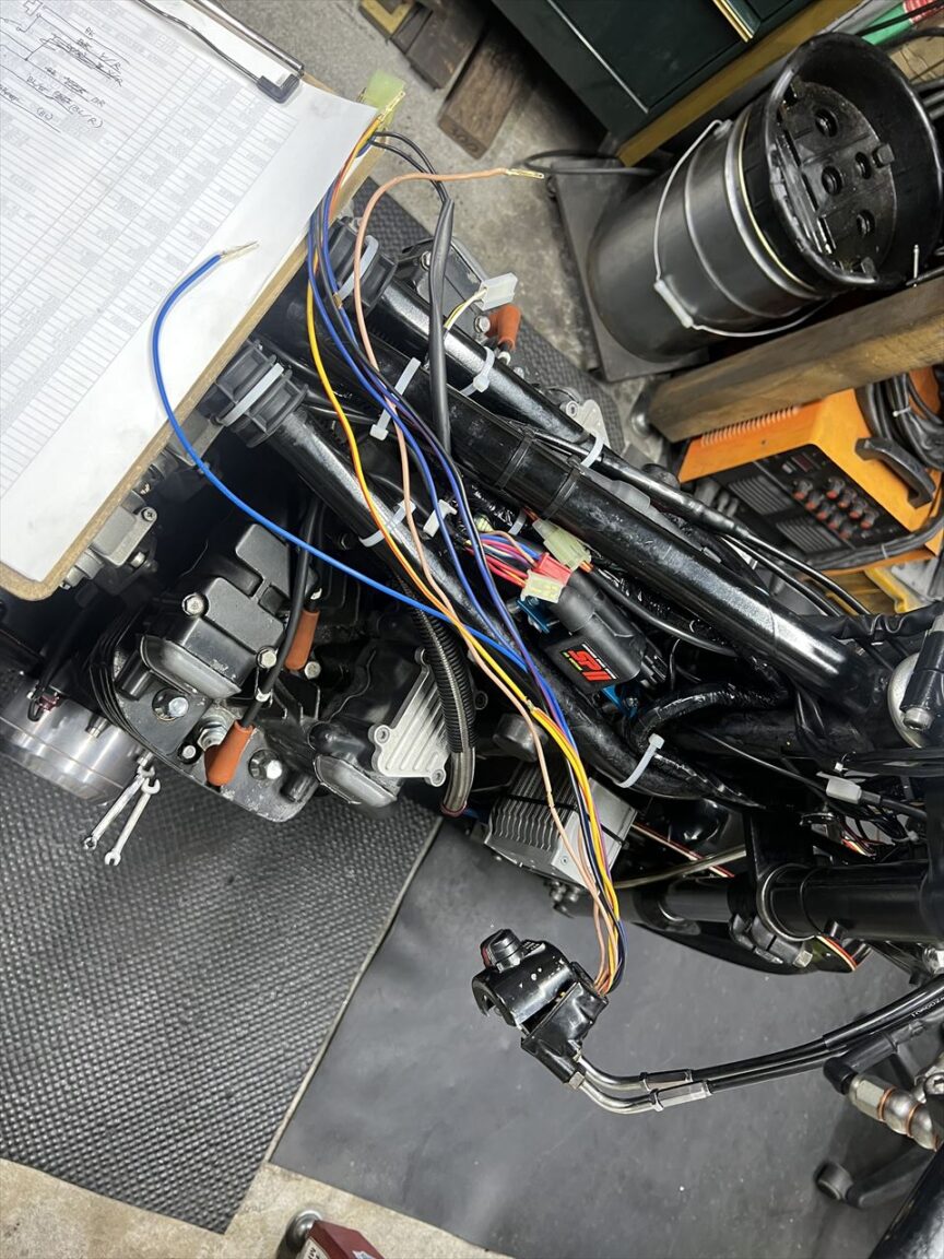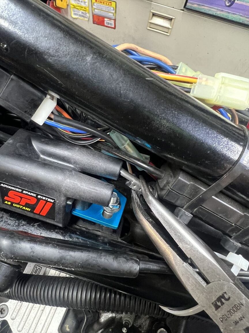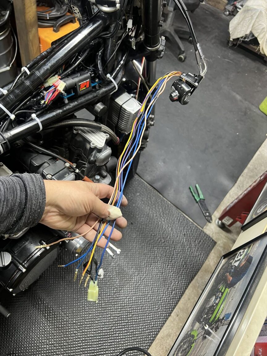 配線の動作確認をしてみると、照明のON・OFFがスイッチ通りに動作しません。右のハンドルスイッチのハーネスを開けてみると、過去の改造の痕がありました。これが原因のようです。